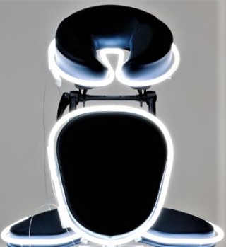 כסא מסאז’ כחול מוקף צינור נאון. העבודה של ברק רביץ AURA 3 מצליחה להיות כס מלכות וכסא חשמלי, מרכבה שמימית ואיזכור של שבריריות החיים. אם יתנתק החשמל, האור, האאורה המקיפה את הכסא, המגוננת, הזוהרת – תעלם באחת. הכסא יוותר אוביקט חסר חיים, גוף ללא הנשמה.