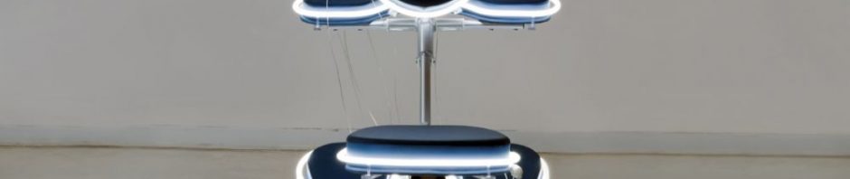 Aura 3 by Barak Ravitz, a blue massage chair surrounded by neon tubing, succeeds in presenting itself as a throne as well as an electric chair, both mystical chariot and memento of life’s fragility. If the electricity fails, the light – the protective, glowing aura surrounding the chair –– would disappear immediately, leaving it lifeless, a body without a soul.