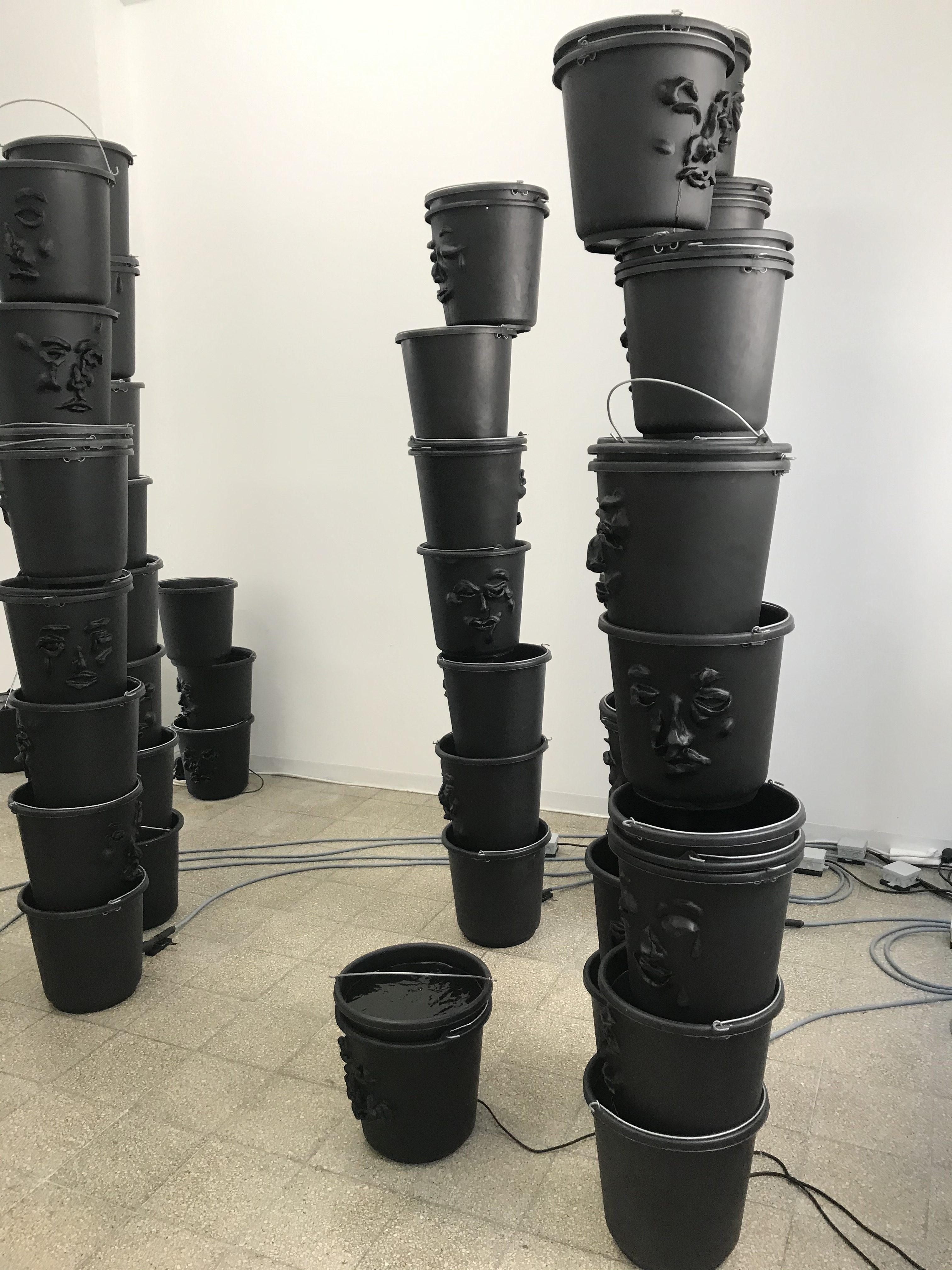 She added faces to the pails that look like masks from the Commedia dell’Arte, or gorgons such as found on ancient gutters, looking like pantomimed faces with exaggerated emotions who are conveying the truth. The pails are stacked like totem poles up to the ceiling, with wires causing water to flow to form a kind of fountain. The pails are constantly “weeping,” with a feeling that in another moment, with another tear, they will come alive. The role of the Greek chorus was to describe offstage events, advance the plot, and act as the omniscient narrator. Shahar’s chorus is silent, weeping, imprisoned in stop-motion like an animated film refusing to run. The combination of the faces on pails associated with cleanliness and purity, also are associated with low-paid “black labor” with its associations to racism and immigration.