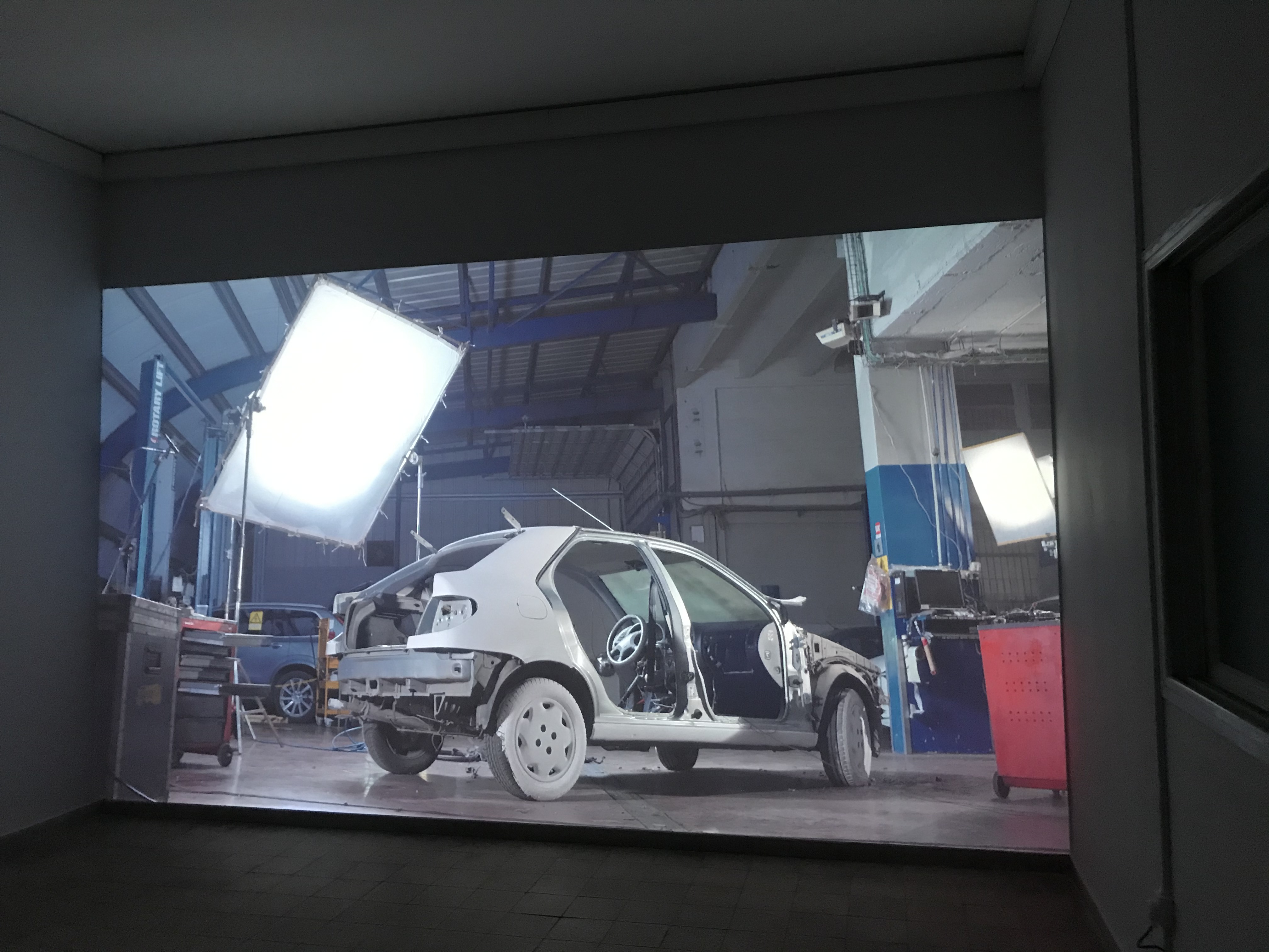 The video works are overall extremely polished, with the sheen of advertising clips. Renana Aldor’s installation depicts a space with airbags emerging from the steering wheel with a film documenting the manual deconstruction of a car. Her works, To De-Construct a Citroën (2DCaC, 2020) and Gate (Airbags, 2020), form a contemplation of death and finality and their relationship with consumerism. She painted the car so white it loses its concreteness to become a ghost. The car, as a symbol that changed from utopian (freedom of movement, independence) to dystopian (environmental damage, danger to one’s health, unraveling of social fabrics) is revealed by its manual deconstruction as something weak and hollow – an empty shell.