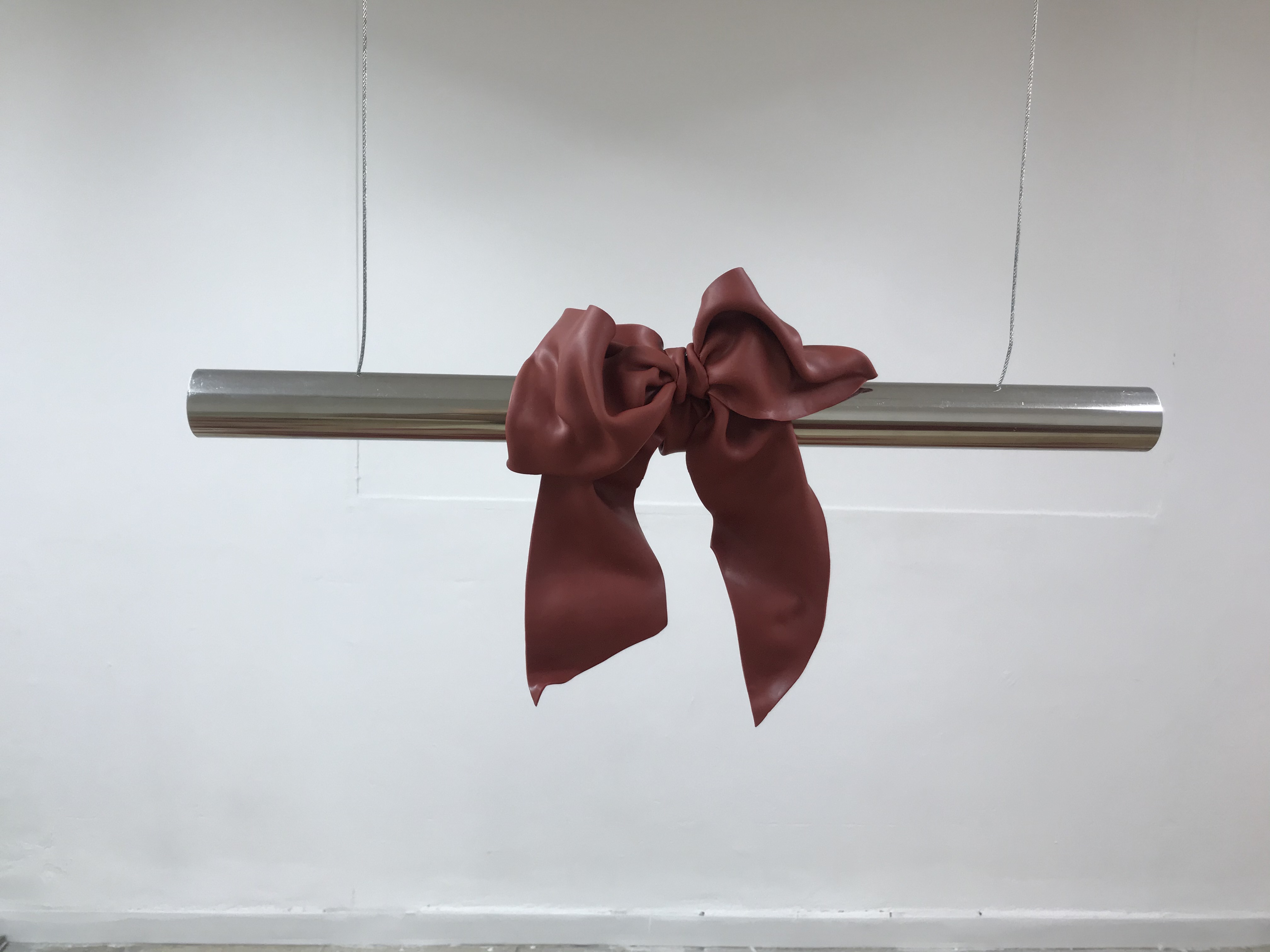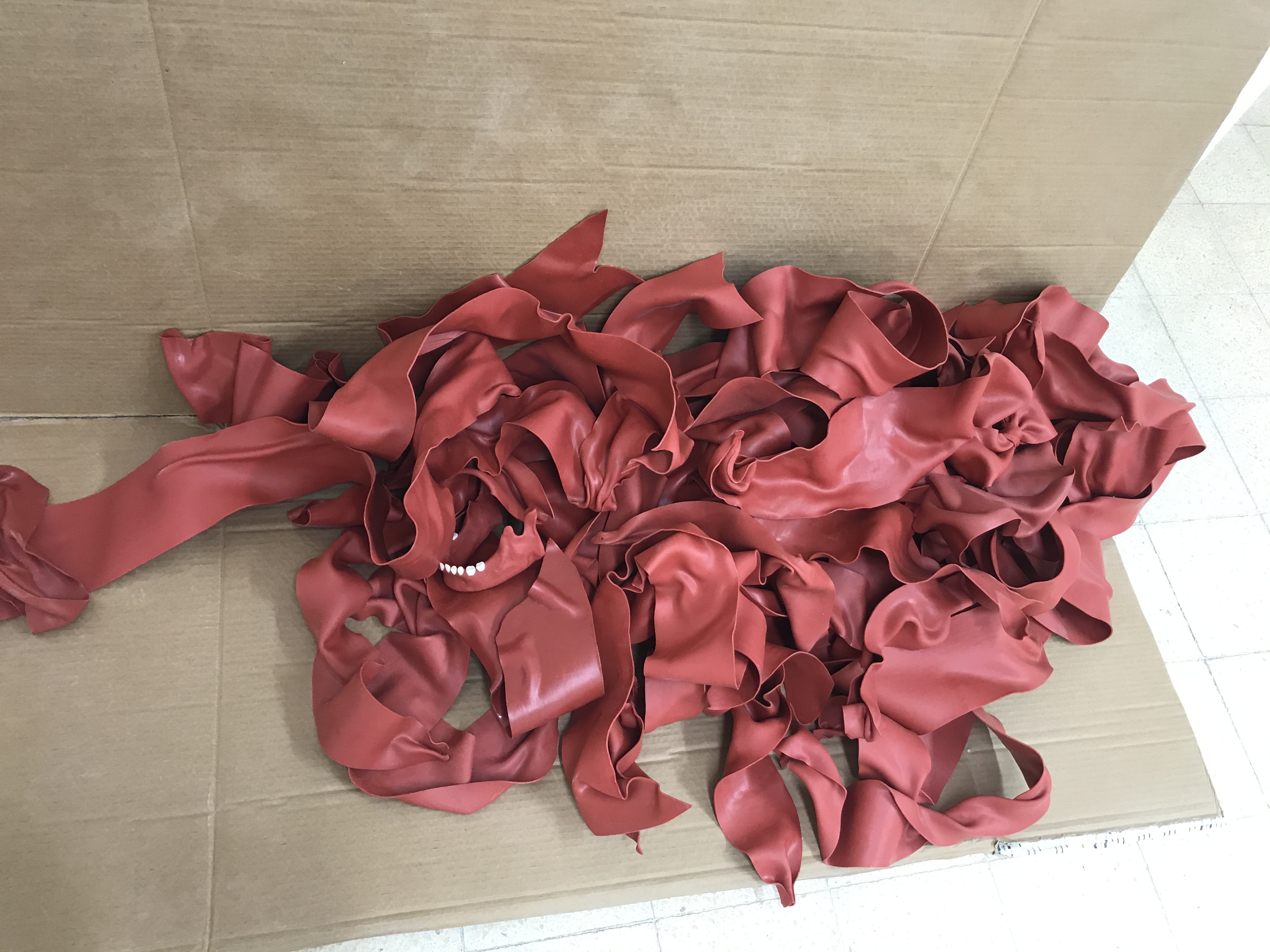 Roni Landa, who has become identified with a series of scenes of feasts and food made of polymer “meat,” exhibited several times and currently in the old Tel Aviv City Hall, here presents Post-Promise, a mixed media installation. A red “ribbon” made of polymer is placed on folded cardboards. A close look reveals teeth. At the center of the space, a gift bow is tied onto a swing, as if representing a body that has disappeared. The dark world she has created is decadent, troubling, and heartrending.