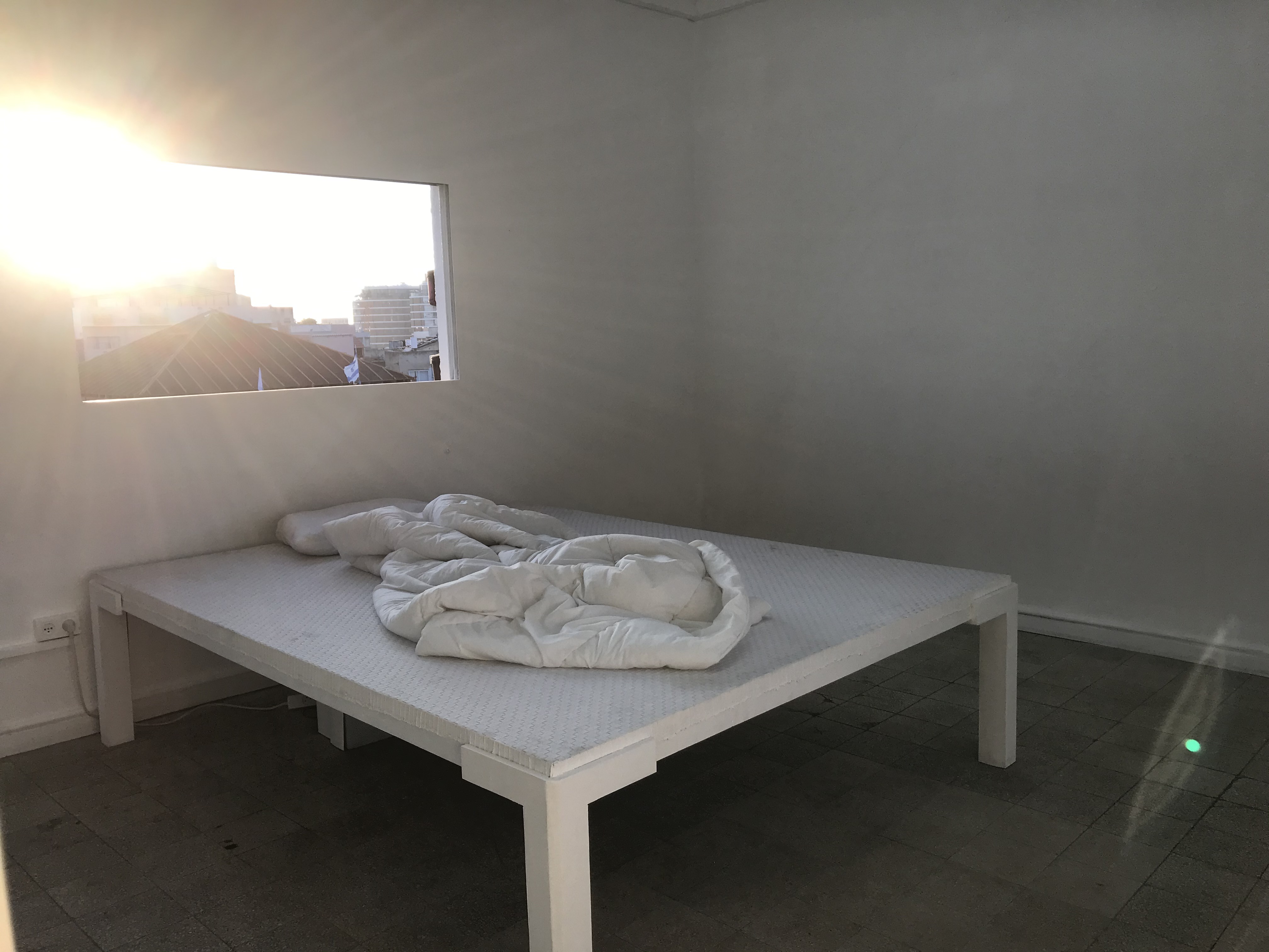 Maya Dikstein and Omri Danino are also exhibiting outstanding works, but I was unable to view them properly during my visit. In Dikstein’s video installation, human bodies become musical instruments through the dental floss stretched in the space, hybridizing the terrifying, the macabre, and the idiosyncratic game from art history. She is referring to Duchamp’s Mile of String (1942). The main thrust of Dikstein’s work is performance, but there was none when I visited. Performance-based works exhibited in ongoing exhibitions and on video for the most part are almost always problematic, and it is doubtful that this medium is suited to a graduates’ show. The sound in Danino’s work Room 313 did not work. Nevertheless, the blindingly-white space he created in the room opening up into the rough industrial space which is the Bezalel building seems like an abandoned movie set, leaving a sensation of astonishment, as if we entered a prohibited area.