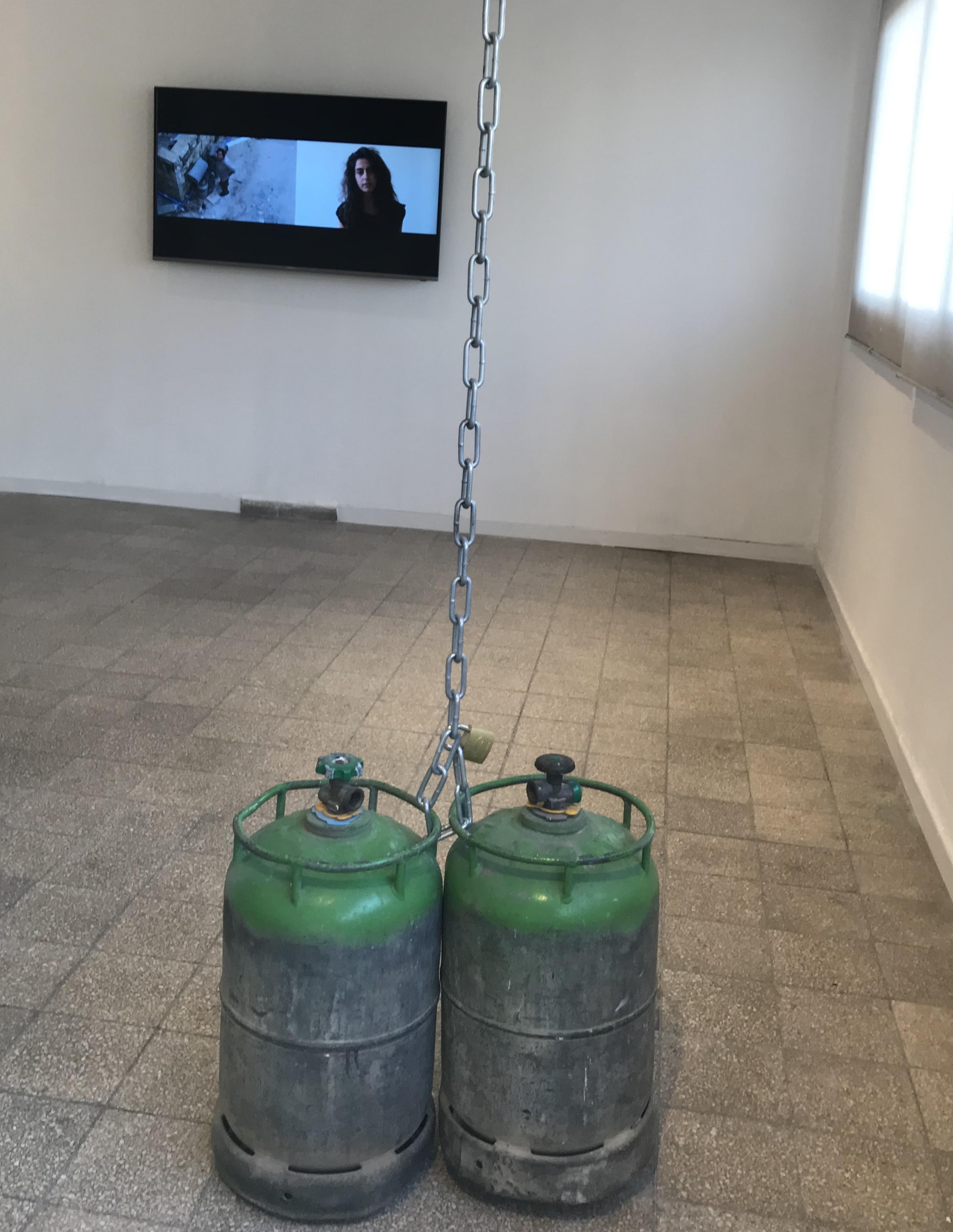 חמודי ג׳נאם העמיד שני בלוני גז קשורים לתקרה בשרשרת ברזל מול עבודת הווידאו העשויה מסך מחולק בו נראים נסיונות לפתוח בלוני גז וקולות ההתדינות על כך. לתחושה של חוסר אונים, סכנה ומודעות להכרח, לצורך בגז מתלוות האסוציאציות של מוות וטרור, של הרגע בו היומיומי הופך רעיל.