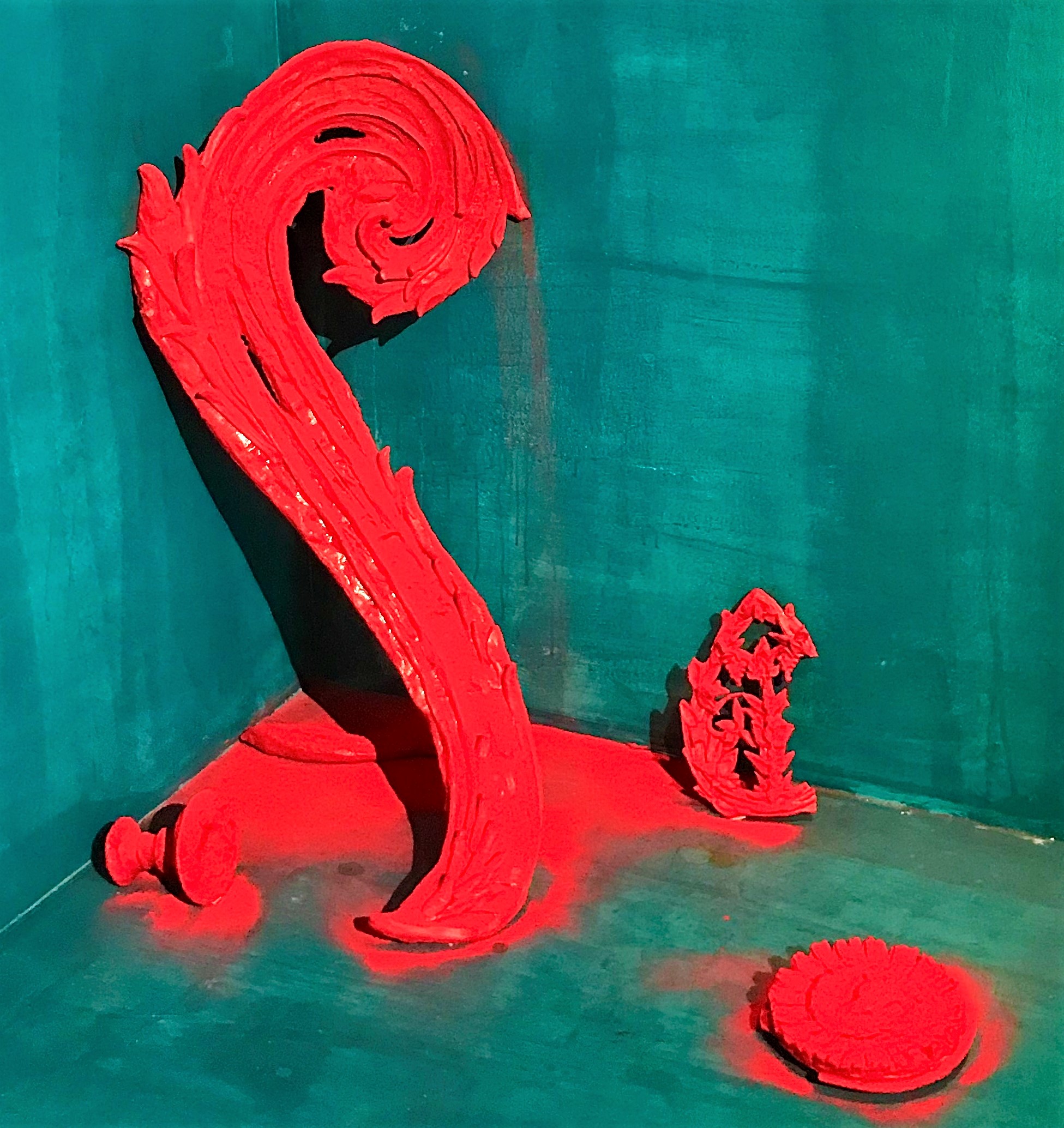 The cultural encounter/memory thus formed is multilayered and firmly planted in history and art history, saturated with sensuousness and love, with an almost fetishistic attitude to the material. Eliyahu makes breathtaking use of a color that is not frequently used in Israel art; a sweeping generalization would characterize it, even today, as restrained coloration. The red and blue refer to the colors used in art history to depict the Virgin Mary whose figure embodies mercy; the rich, velvety pigment as in Anish Kapoor’s works (an artist who immigrated to Israel from India in the 1970s and continued to the UK) creates a crispiness and the feeling of danger, as if a slight breeze could remove the rich coloration along with its charm and softness. The objects denote disaster, from the memory of the vessels from the Holy Temple depicted on the Arch of Titus, a persistent memory in the Jewish collective unconscious, to photographs from the Holocaust of desecrated ritual objects. Beyond all of the above, beyond the story of immigration is a story of the disaster. Out of the fragments, Meydad Eliyahu has created precious objects conveying long lost riches and past satiety, a breathtaking depiction of the fading of a forgotten culture.