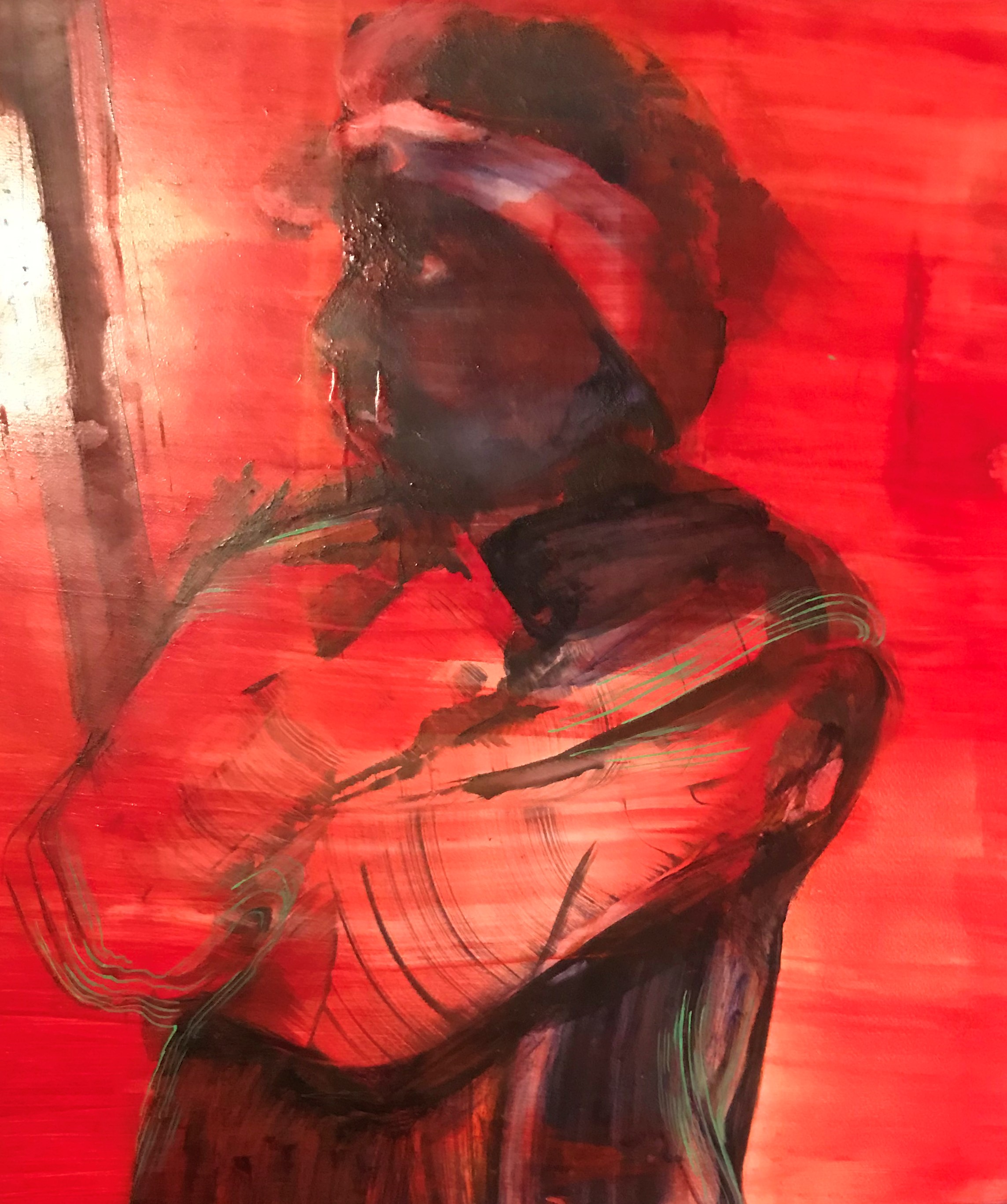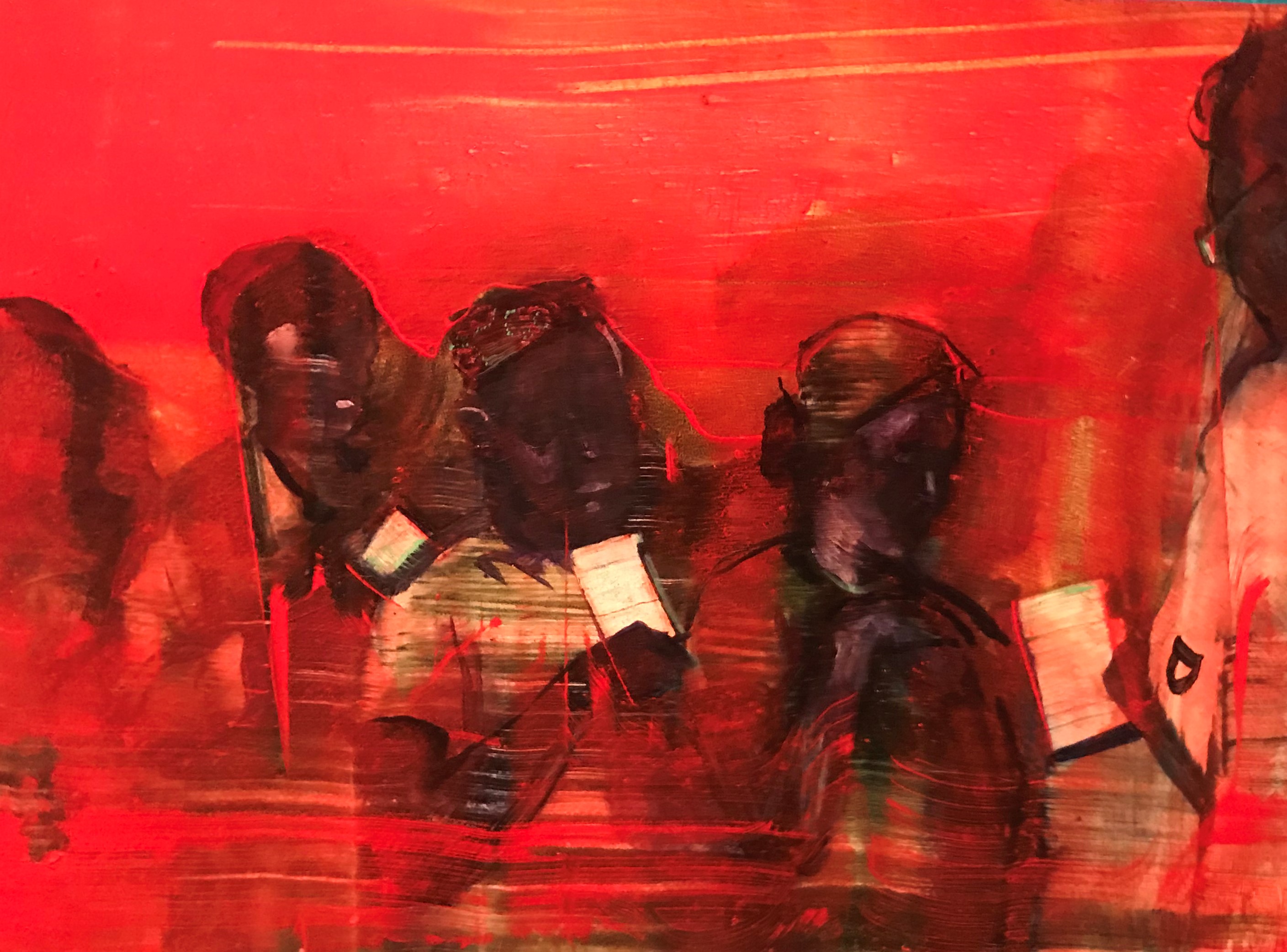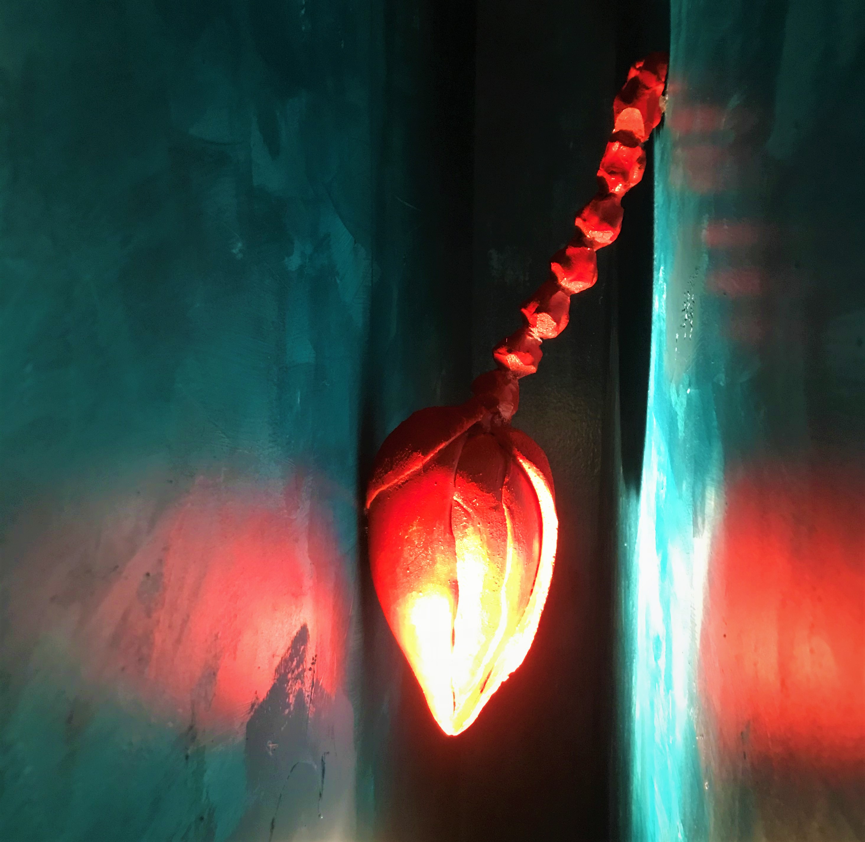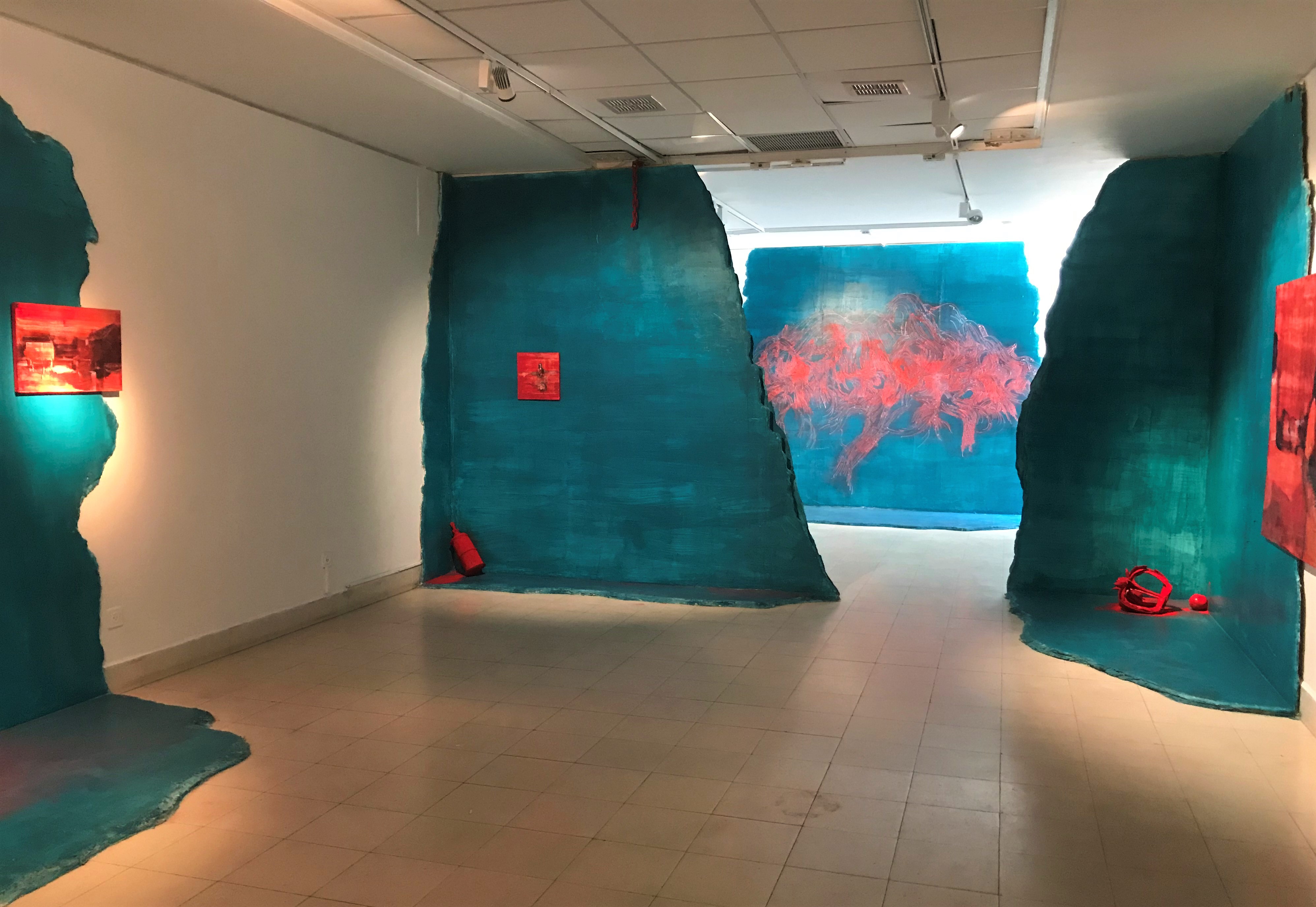 The objects on the threshold, fragments of decorative architectural elements and images of ritual objects of the Jews of Cochin, especially the pomegranate-shaped embellishments for the Torah scrolls, are very moving. Eliyahu places them in the blue wall niches he constructed, as if in clouds of consolation in the river of memory, and suffuses them with red, enveloped in pigment.