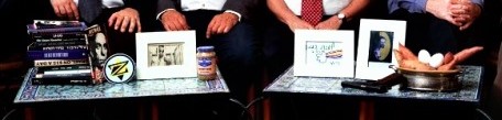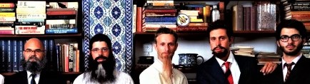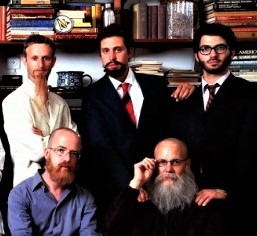 Men in Israeli Culture (Beared) was exhibited at the Tel Aviv Museum of Art in 2016 in the exhibit “Roee Rosen: A group exhibition – a mid-career retrospective,” curated by Gilad Melzer and Joshua Simon. The reference in the catalog is interesting: no details are given about the people in the photograph (nor that Simon is in the work) but there is a discussion of the objects on the table and how “the space in which the visual operates – the photograph, the group portrait, with its theatrical placement of the figures – is the space of the texts. The background on which to place the selected group of men – with the parody of emphasizing their masculinity through theatrical “costumes” of beards – is a library.”
