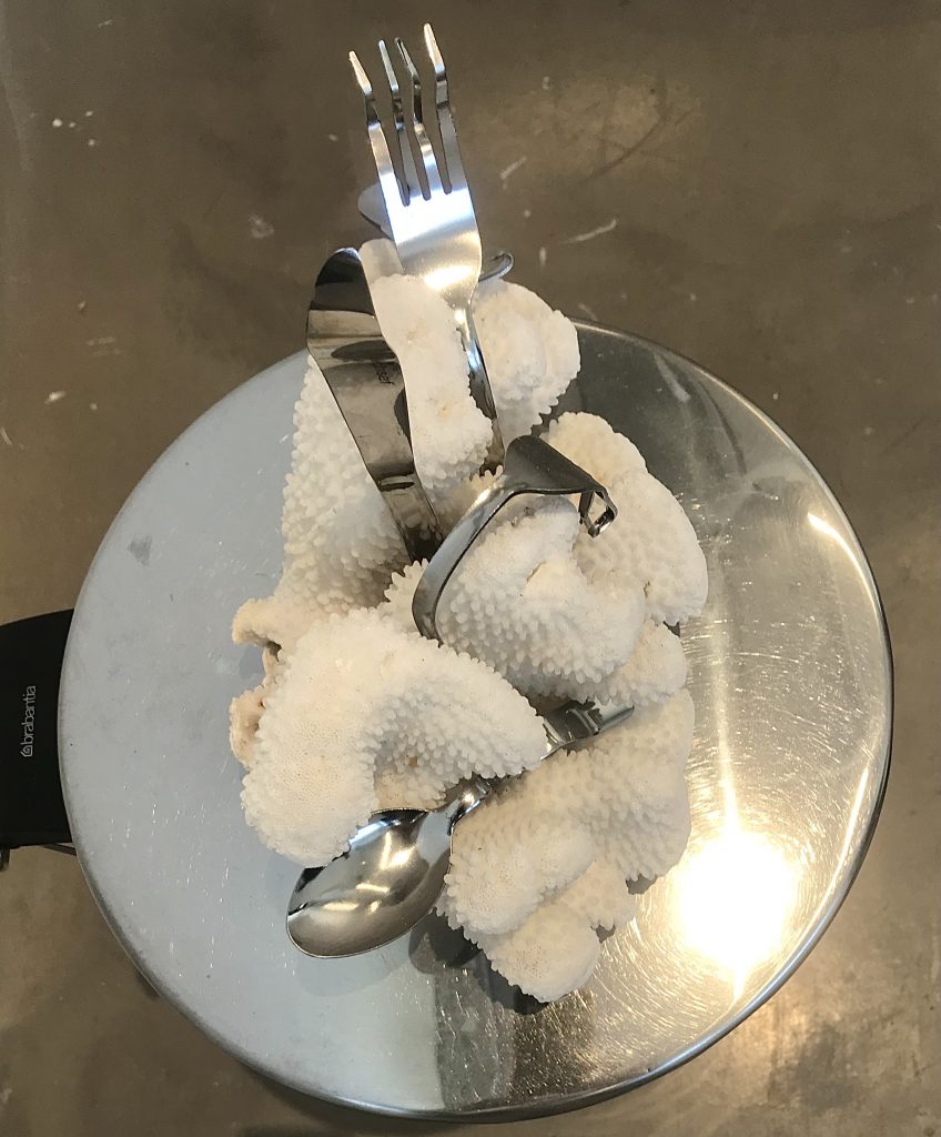 A careful balance of forgiveness and cruelty turn “A part from me” into one of the most precise exhibitions I recently viewed. A severed paw lies on a sofa, a distorted coral imprisoned in cutlery is placed on a garbage can cover, while eyelashes float in a basin sunken into a bed.