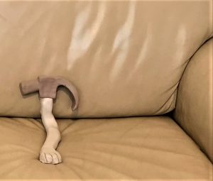 A glove represents a crushed hand underneath a grey kitchen door; a thin, almost liquid dog’s paw is the handle of a hammer placed in a comfortable position on a leather sofa. Another hammer lies on the sofa with a cigarette looped through the two sections of its claw head. The hammers, limp and exhausted, failed to keep their promise of power and energetic action.