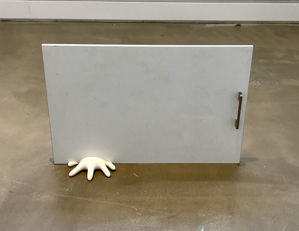 כפפה המדמה יד נמעכת, כמעט נקטעת, מתחת לדלת מטבח אפורה, וכפת כלב דקה ,כמעט נוזלת היא ידית פטיש המונח, נינוח על ספת עור. על הספה פטיש ,נוסף שסיגריה משתרבבת בין שני חלקי המתכת המיועדים לחלץ מסמרים. שני הפטישים מפרים את ההבטחה הצפונה במהותם לכוח ונמרצות . כאן הם רופסים, מונחים באפיסת כוחות. ההיברידיות של אדם/חיה/אובייקט חוזרת בוורסיות שונות, וזיכרון ספל הפרווה של מרט אופנהיים מ 1936 מרחף בתערוכה. בספל, התגלמות מזוככת של סוראליזם, נחגג הניגוד בין חושני למסר, נועם הפרווה ואובדן אופציית השימוש בספל ובכפית למטרתם הראשונית. המוות והרוע האינהרנטיים לפרווה, למטרה כה חסרת תוחלת ככסוי ספל, נותרת תלויה באוויר.