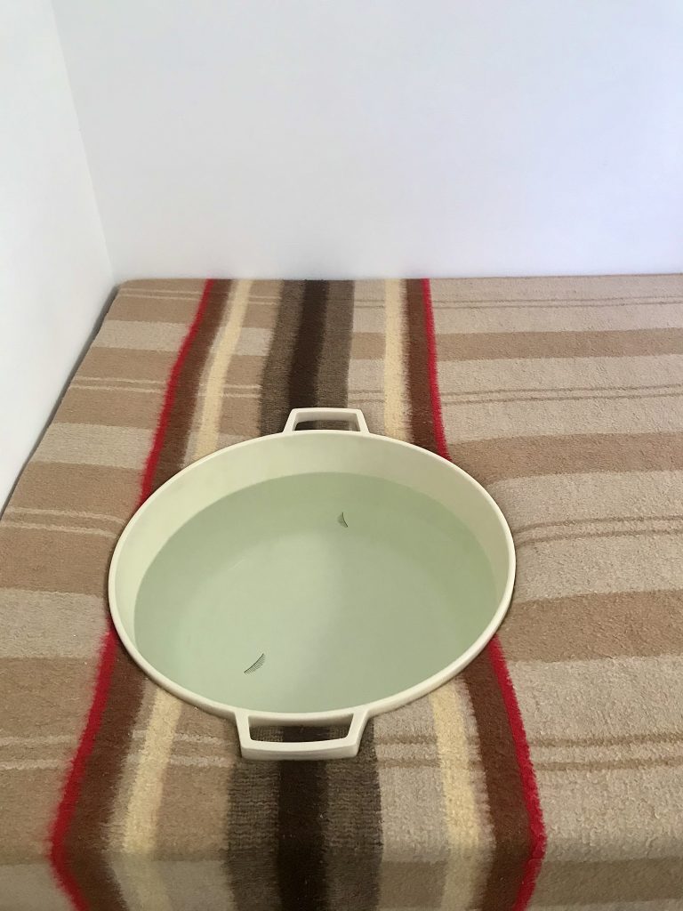 היופי הדקיק, שמשוך על המערך השברירי של הבית מגיע לשיא בחדר השינה בו גיגית משוקעת במיטה ושתי ריסים מלאכותיות צפות בה. הדימויים הנרמזים מציפים את התודעה- מהעין החתוכה הפותחת את “כלב אנדלוסי” של בונואל ודאלי ועד צילומי אולטרסאונד הריון בהם נראים לפעמים פרטים עדינים כמו ריסים בעובר ומדגישים עד כמה הישות הקטנה , שעדיין מוגנת מצב עונג (כמו שהגדיר זאת פרויד) כבר דומה לנו. הגיגית, כמו ראש מגוחך עם אוזניים ידיות, מכילה מים, סמל לתת מודע ,אך היא כראש ערוף ללא גוף.