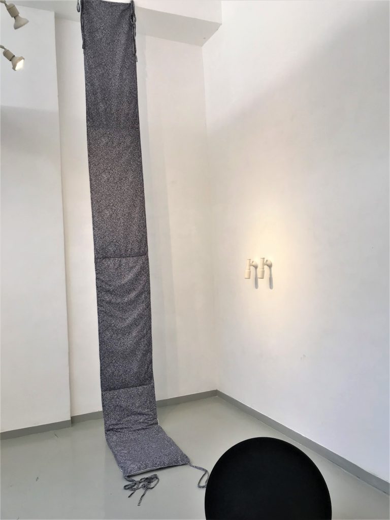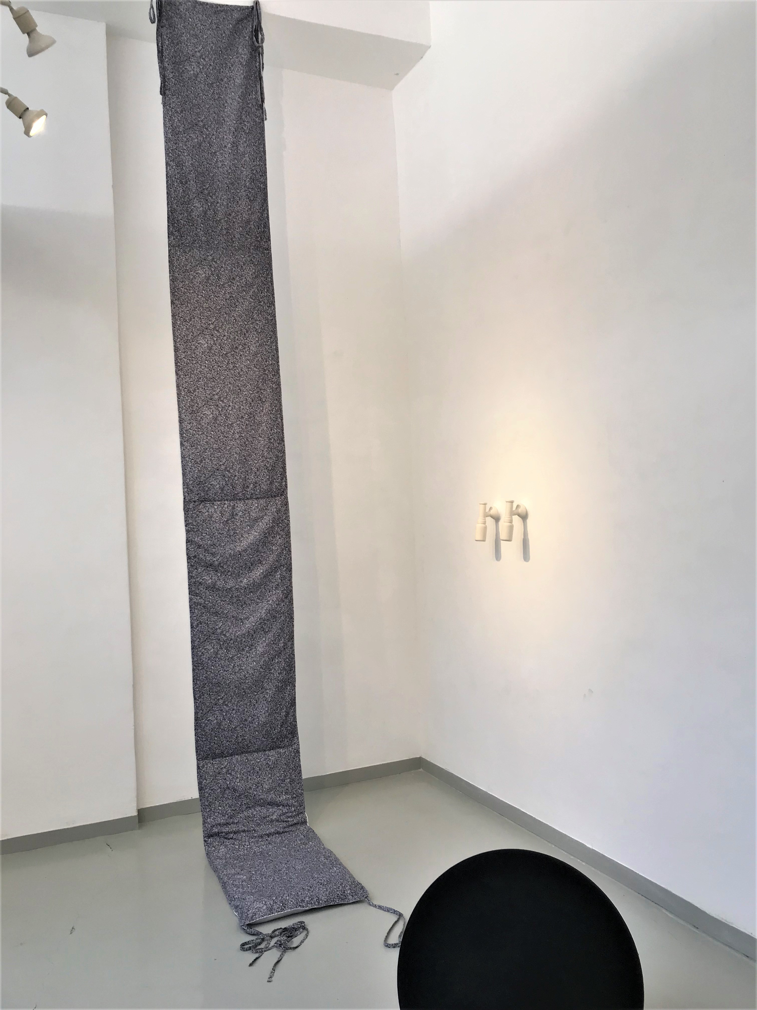 Rubinstein uses this tradition to create baby accessories filled with anxieties, nightmares and vulnerability, enlarged to a monstrous size. A normal-sized, blackened fitness ball, rolls through the space, while two ceramic breast pumps attached to the wall look like candlesticks or perhaps some industrial object. The entire installation speaks of disruption, severance, and mechanicalness.