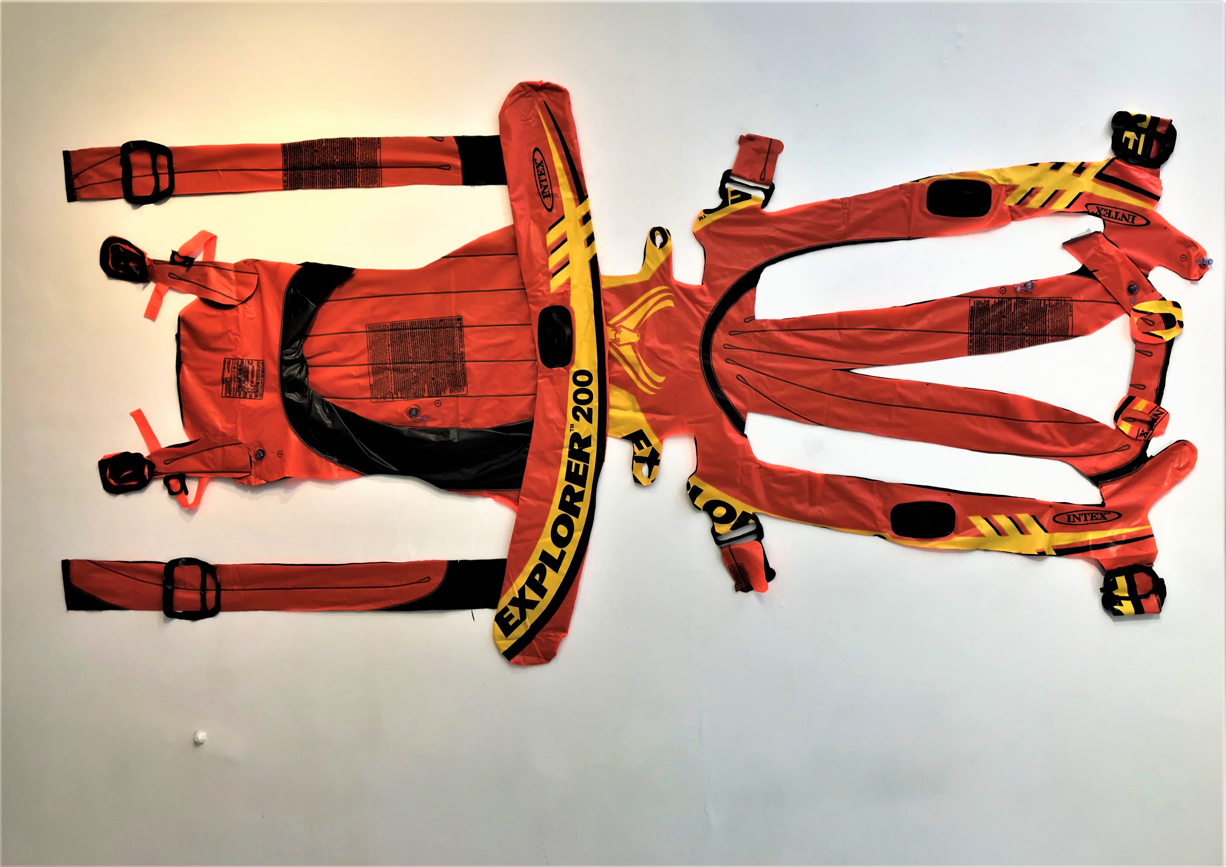 The baby carrier made from the life raft is mounted on the wall like a trapper’s animal hide. The pieces cut from the orange and black plastic with the printed texts on them look weak and alien, certainly not the material in which parents would place their children. The whirlpool of associations aroused by the piece are as stormy as the sea which is missing: boats as life rafts comprise contexts from Baby Moses on the Nile, saved from the genocide of the Hebrew babies in Egypt, through the boats that are the last hope of millions of refugees striving to escape to a better life. Rubinstein has created an object that has nothing whatsoever in common with the image it is intended to evoke; instead it emanates doubt: what is the metaphorical function of the baby carrier – should it bear children or their parents? From which storm will it save them?