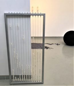לידה וגידול ילדים, חוויה אוניברסלית’ היא בעלת ייצוג מוגבל ביותר גם היום. הכניסה לאזורי החששות והחרדות שבאות על לידת ילד; השינוי של קנה מידה במובנים הקשורים לשינוי של הגוף הגדל בהריון ומתגלה כאלסטי , וגם לתפיסות סדר עדיפות עלולים לגלוש בקלות לרגשנות. ללא פאתוס, בתערוכה הקטנה והמדויקת רובינשטיין מדברת על המעגל של לידה וראשית וסוף. דרך שתי משאבות החלב היא מעירה על הסכנה שהמקום של האם עלול להיות מצומצם לתפקיד מכני וכך בחשבונייה שפטמות מחליפות בה חרוזים. מעניין לחשוב על התערוכה בהקשר לעבודות כמו המעקב של מרי קלי בשנים 1973-1979 אחרי התפתחות בנה , וגם לחזור לעריסה שיצרה מונה חאטום ב 1993 ושמה Incommunicado חוסר תקשורת. קלי אספה ותיעדה תהליך, של הכרות, גדילה, תהליך היפרדות דרך חפצי היומיום ויצרה יומן/דיוקן של תקופה והלך רוח. העריסה של חאטום איבדה את האפיונים של עריסה כמגינה, מעין תחליף רחם, והפכה למכשיר סדיסטי עם חוטי מתכת במקום מזרון. שם התערוכה, ” עריסתו של ניוטון” היא כשם משחק מנהלים הפועל על עקרון פיזיקלי של שימור תנועה ואנרגיה קינטית. הכדורים בדרך כלל תלויים בין מסגרות מתכת, זזים אך כלואים במעגל אינסופי. רובינשטיין מחווה כלפי המבנה הזה בהצבה בחלל, וגם בכדור השחור אך מעבר לכך , כמו המשחק הנושא הוא תהליך חוזר, הנדמה כאין סופי, של אימהות, על מורכבויותיה.