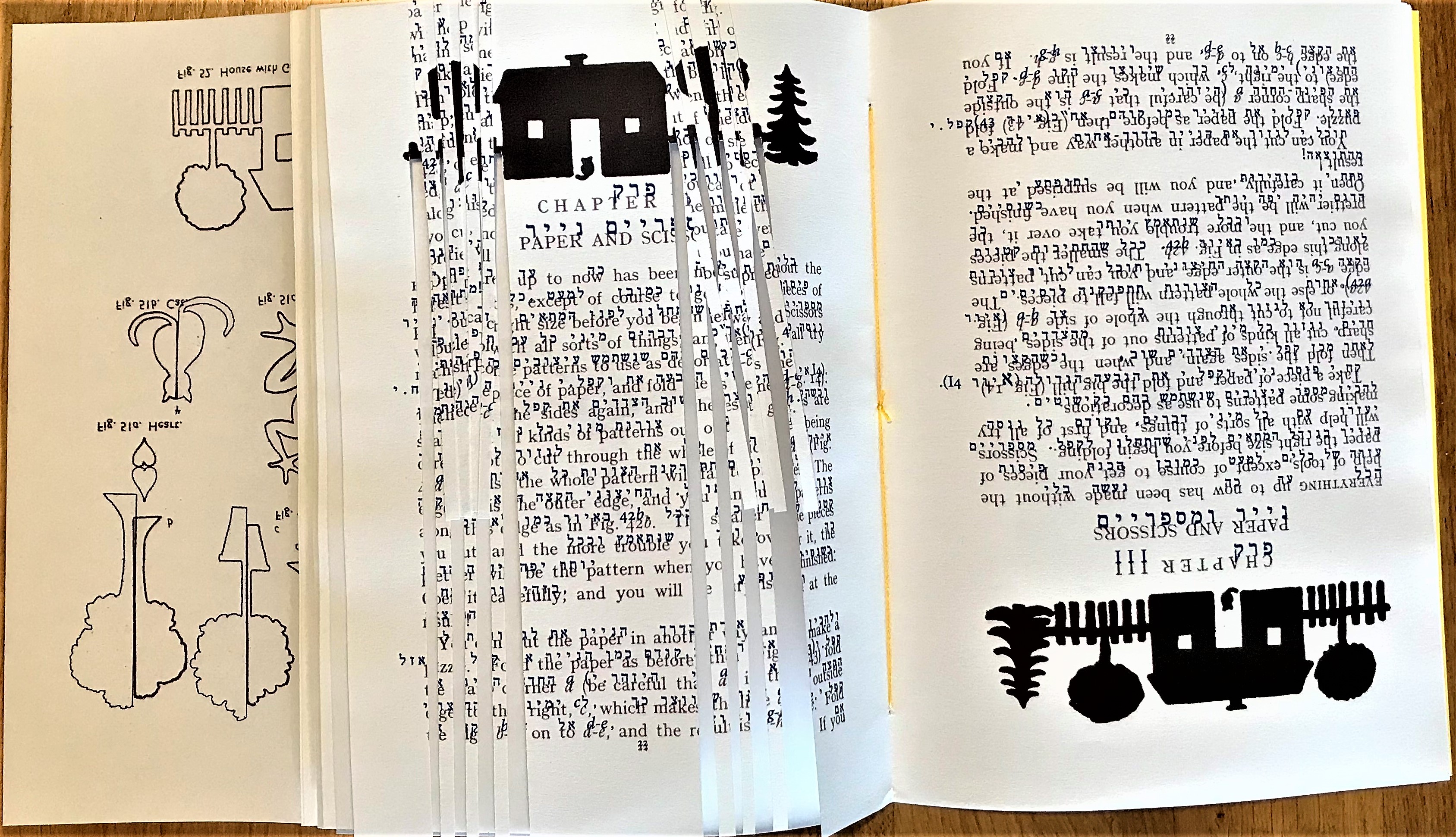 Laviv has fulfilled her intention stated on the opening page, to “translate and leave the source…My intention is not to obscure something clear, but to clarify a little what is obscure.” The cloud is of the past, the incomprehensible gap between the surface feeling of safety and what actually happened during the period encompassed by the book. The texts in Hebrew, English, German, and Swedish are printed in different fonts and colors, superimposed upon each other, yet can be deciphered. Tracing paper pages as part of erased memory, and several lined pages are bound with the printed pages, like heavy drops of memory dripping into the consciousness. Along with the texts are folded pages with cut-outs of churches and houses, trees, children, animals, and plants, reminiscent of the Burda dress patterns that were popular until the 1980s.