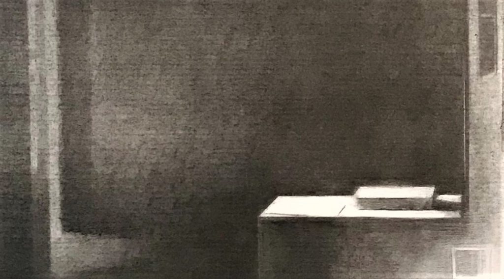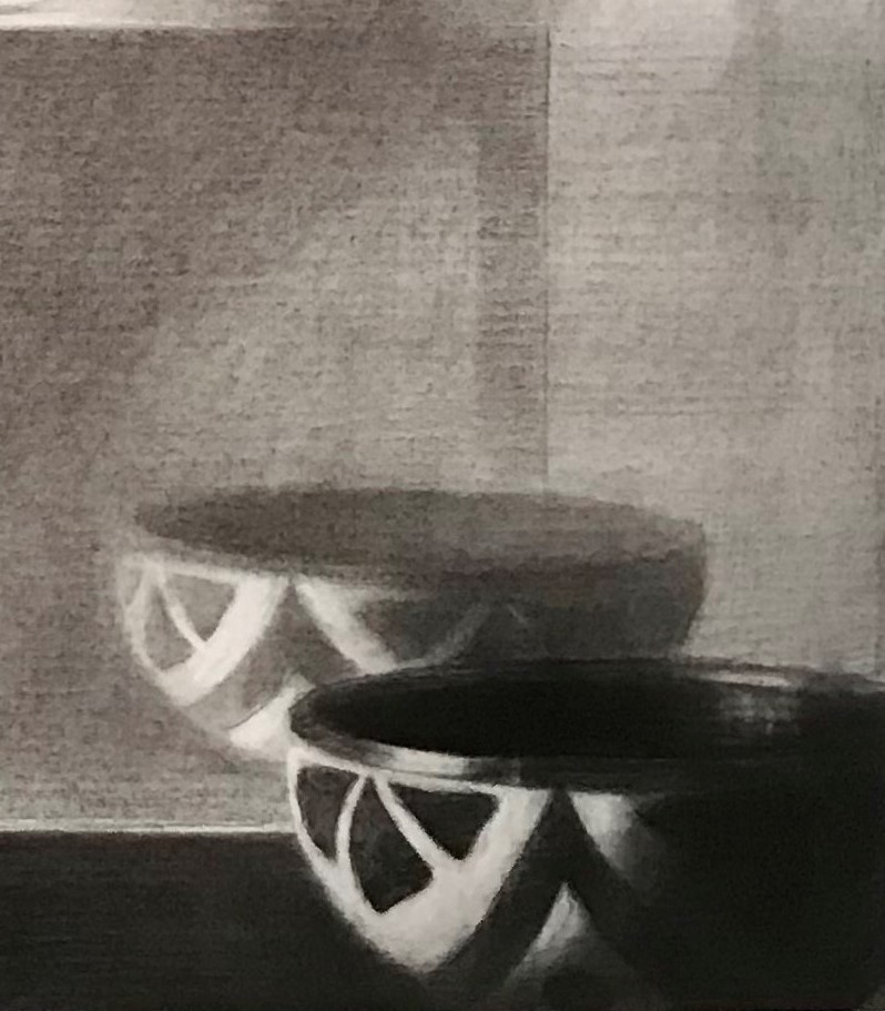 קערה מוכפלת בקדמת רישום של סימון אדג’יאשווילי מגדירה חלל . הקערה, כנראה פורצלן אוזבקי ניצבת על מדף שמאחוריו מראה. היא מוכפלת בתוכו ומאחוריה משתקף משתפל חלל תמוה, מעורסל באור רך.