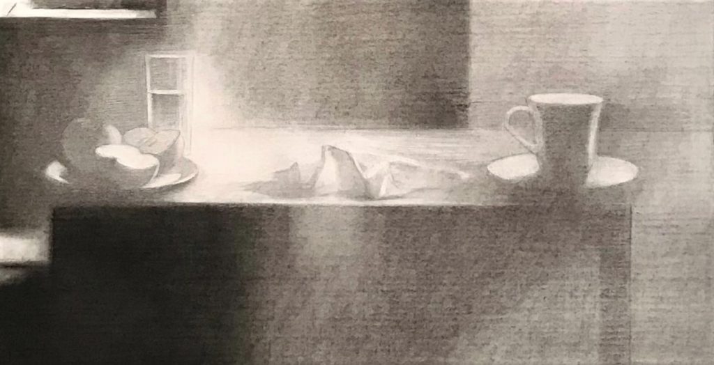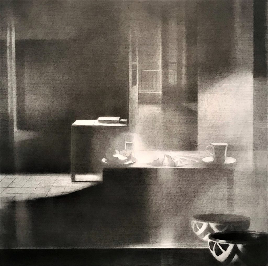 Contours of doors and windows emerge out of the light, openings and secrets in an order that defies all logic. Two tables in the space function like altars: a cup, cloth, and cut apple appear on the closer table, taking us on an impossible cultural journey from the Garden of Eden to Cézanne.