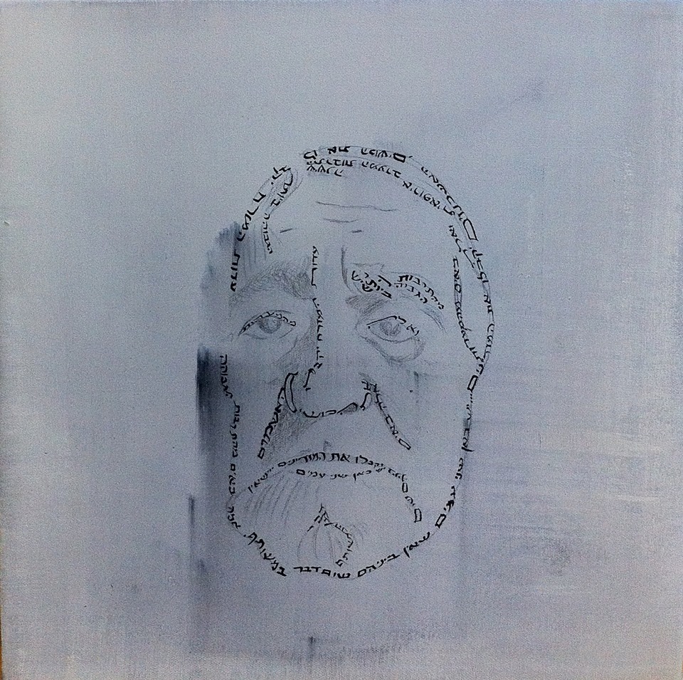 Shula Keshet’s exhibition, For the glory of the State of Israel (the phrase used in the official torchlighting ceremony on Independence Day), makes a sharp statement of public protest. Keshet created micrography portraits of leading Israeli political and cultural figures from the pre-state period to contemporary times. Using a traditional Jewish art form, micrography, Keshet uses the minute letters to create portraits. In this case the words are quotations from the subjects’ writings and statements of racist sentiments about Jews from Moslem countries. Keshet traces the line of racism from Arthur Ruppin, one of the early Zionist leaders in Mandatory Palestine-Eretz Israel in the 1920s and ‘30s through pivotal statesman David Ben-Gurion and contemporary culture figures Natan Zach, Mati Caspi and Efraim Shamir.