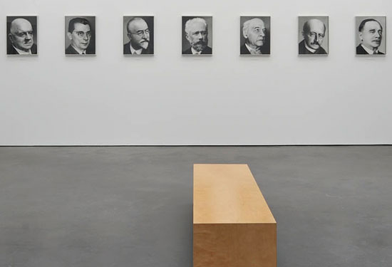 The second tradition Keshet refers to is the genre of “portraits of great men” often found in libraries and university buildings. This is a long European tradition, and interest in it was revived by Gerhard Richter’s key work, 48 Portraits, painted for the German pavilion of the 1972 Venice Biennale. He created 48 individual portraits of historical figures for the exhibition space of the pavilion: writers, scientists, composers and philosophers can be found, whereas politicians and visual artists are not represented. Franz Kafka, Thomas Mann, Albert Einstein and Oscar Wilde are among the most famous, alongside some less-known individuals.The 48 Portraits depict solely white central European and American males, born between 1824 and 1904. Missing are women and non-Europeans (although there are Jewish figures, further evidence of the Gordian knot of the Jewish-European connection). The work generated a wave of reactions and artworks.