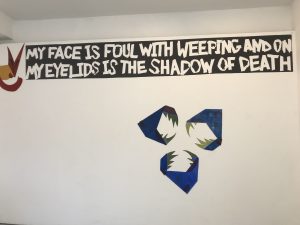 Job 16:16 מיצב של ליז שניידר בנוי צורות פשוטות צבעוניות מנייר וקונסטרוקציות עץ מהן היא בונה יצורים שמזכירים בעלי חיים מוכרים לנו אך נותרים דמיוניים. הצורות הזוויתיות מעלות על הדעת אמנות ישראלית של שנות ה 50 (גומפל) אך גם את מירו וקלדר. על הקיר המרכזי צורה שמזכירה את הסימון של זיהום רדיואקטיבי תחת ציטוט מספר איוב (מכאן שם העבודה). ציור מרשים בירוק זרחני של דמות גברית מזכירה את הציור האיטלקי של סוף שנות ה 80, במיוחד פרנצסקו קלמנטה. שניידר מציעה התייחסות מעניינת לנושאים סביבתיים, לשיבוש גנטי, תוך שהיא משתמשת בתנ”ך אך נמנעת מהטון המטיף של הקבלות נבואות וההווה.