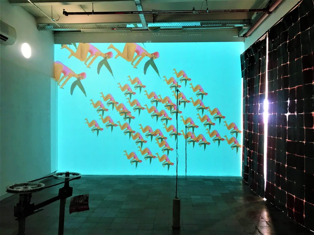 עבודות אחדות מצדיקות, בכל זאת את הביקור. המיצב של תאיר אוריה “אלגוריתם תניני: שם זמני” מצוין. ניכר שנעשה מתוך הבנה של החלל ויצירת יחסים בין מרכיביו. אוריה טווה סיפור אבסורדי, אכזרי ומצחיק בו דמויות נשים שחייניות פוגשות יצור ורוד עם שיני תנין, ובחלל רישומים סובבים בעזרת גלגלי אופניים. הכניסה לחלל ה היא דרך וילון העשוי כהמשך הרצפה האפורה -אדמדמה של האולם כך שהתחושה היא של כניסה למעין מנהרת ארנב, חלל מוסתר שם חוקי ההיגיון משתבשים. בין סצנות מצוירות בווידיאו המזכירות את סרטי המיוסיקלס במים בכיכובה של אסתר ויליאמס בשנות ה 40, למערכות הגלגלים המסתובבים שמזכירים פיסול של פישלי וויס, אוריה מדברת על אימה וסובלימציה.