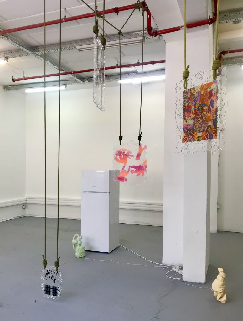 Johad Arkin’s installation Nice and gooey stands out due to its extraordinary use of materials, from oil vaporizers to a refrigerator, perspex frames and plasticine. His aesthetic of somewhat childlike sweetness contains hints of the darkness lurking underneath the ice-cream colors: the ropes look like nooses, the vaporizers emit evil mists, and the perspex mirrors are covered with plasticine like blank eyes. The installation looks good, amd he uses materials successfully, but the work does not succeed beyond this.