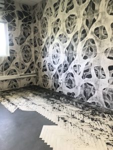 Another successful installation is by Natalia Nosov. She enveloped the space in black and white patterns using a variety of materials including linoleum prints, woodcuts, and more, to create an environment dominated by disorientation and disintegration of the gaze. This brings to mind Yayoi Kusama’s 1960s prints dissolving space and Andy Warhol’s works which followed. Interesting to see how Nosov’s art will continues from here.