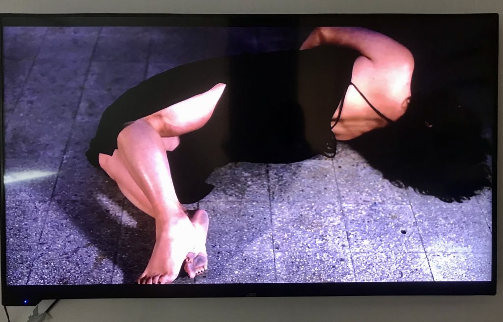 The psychedelic video (sound by Nir Jacob Younessi) remains unassociated to the rest and is unnecessary to the installation. The connection between the purplish-blue image which looking like hemorrhaging on skin, to the projector and the dry luffa “bones” remains unresolved. The image of Asraf thrown onto the ground, with evident inspiration from Cindy Sherman, is effective, as is a small group of photographic images of parts of the body.