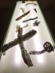 Her story projected on the wall becomes a datum that can disappear when the projector is turned off. The qualities of fragility and exposure of the innards of the works sculpted from luffa (loofah) on a light table are a clear continuation of Asraf’s past work. Cleaning materials, especially steel wool and scouring pads, have been used by her in the past to stand in for household objects from cakes to carpets, and in her video she used steel wool as a replacement for clothing fabric. Here, the emptied luffa looks like the remains of excavated bones illuminated by display lighting as in an archaeological museum, removed and isolated from the traumas experienced by the one from whom they were taken.