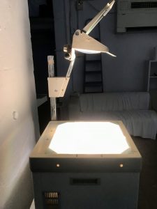 Asraf uses an out dated overhead projector to enlarge and project transparencies, with the EKG charts from the days after her attack and some of the medical documents near it. Visitors can project them in any order they wish or hold them up to read.