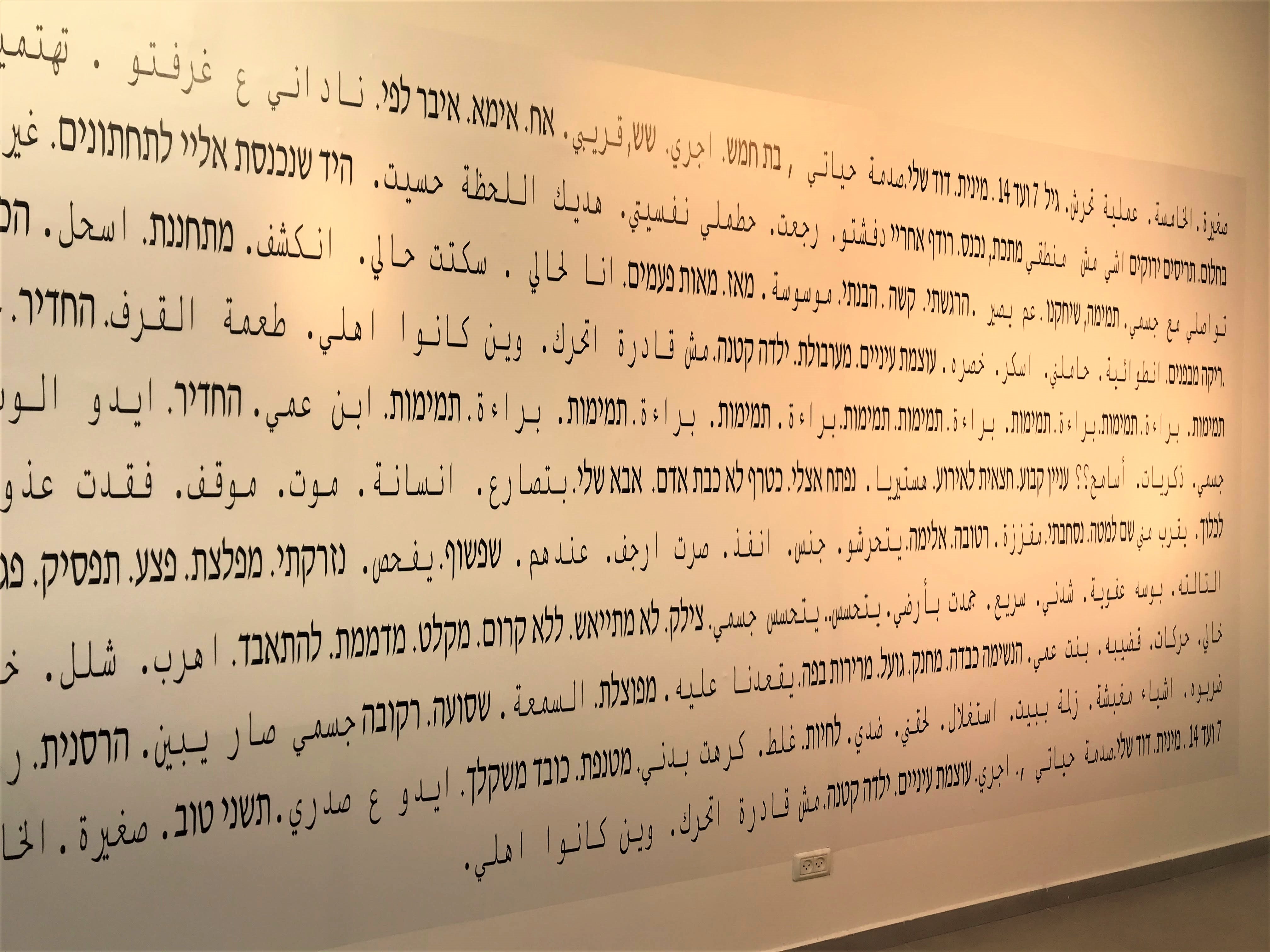 Asraf’s text piece continues her distanced treatment of the trauma. In the same font at regular intervals, the words “clouded,” “responds to pain,” “un-” [conscious] reappear. This small work is very reminiscent of Hala Abu Kishek’s text piece exhibited several months ago at the exhibition “100s of times” at the CACR-Contemporary Art Center, Ramla which I curated. The five-meter wide wall text in Arabic and Hebrew is made up of words and phrases from statements by women who underwent sexual violence. Asraf was supposed to have given a performance at the exhibition but regretfully it could not take place due to the Corona restrictions and postponements.