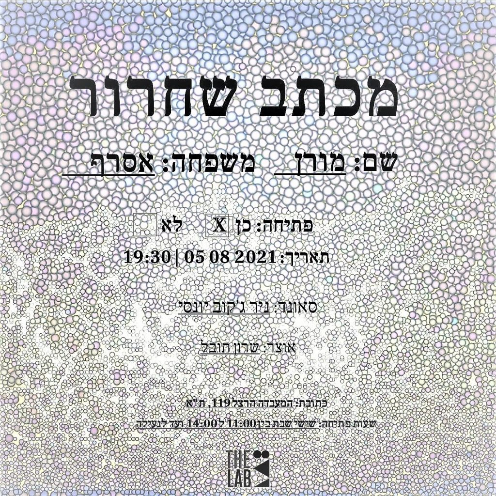 מורן אסרף רוקנה את החלל של “המעבדה” ומילאה אותו בכאב. המיצב “מכתב שחרור”- ניירות רפואיים המתעדים את מצבה אחרי תקיפה שחוותה, דימוי הנראה כצילום משטרתי שלה עצמה במצב בו נמצאה ועבודת וידיאו סאונד לפי הלמות ליבה (בולטנסקי עולה מיד על הדעת). במיצב המאופק יש איכות של נגיעה, חיכוך עם העולם שהיא מעבר לשאלה עם כל חלק בו מוצלח או מצודק. זו עבודה אוטוביוגרפית בלי להפוך פרט זה קרדום לחפור בו אך עם עוצמה כנות שלא ניתן לטעות בה.