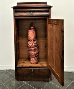 The biographical similarities between Ryback and Yam are clear (Russian-born immigrants) and deal with similar subjects (as do another billion or so artists), mainly families and interiors, but their sensitivities are entirely different. Yam’s ambivalence does not resonate with internalized, nostalgic depictions like Ryback’s, and certainly not with works like Berlin Woman. The exhibition booklet states that the pieces by Eshel Gershuni “have the quality of Judaica objects bearing connections to sacrifice and death.” On the contrary: they bear Christian and pagan qualities. Installing her sculpture inside the furniture is well designed but does not come to more than that.