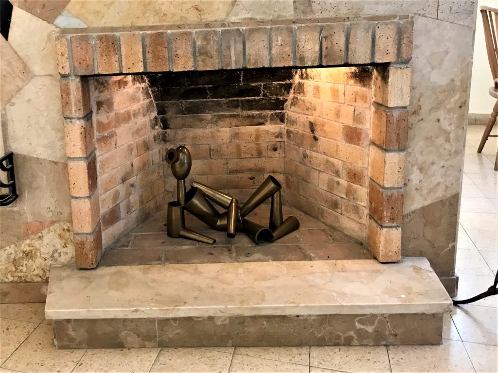 The second part of the exhibition in the Shalom Asch House is better, charging the space, the House, and the works with associations and threads of meaning between them. Ohad Meromi’s bronze sculpture, Popova, installed in the fireplace, stands out especially seeming like Popova’s own Futurist-Cubist figures. Both Popova and Ryback moved between movements and styles from Suprematism to Constructivism. The reclining figure, a hybrid of the Tin Man and a dystopic Expressionist robot, transformed the fireplace in which it is placed into a small theatre, an exposition of the continuation.