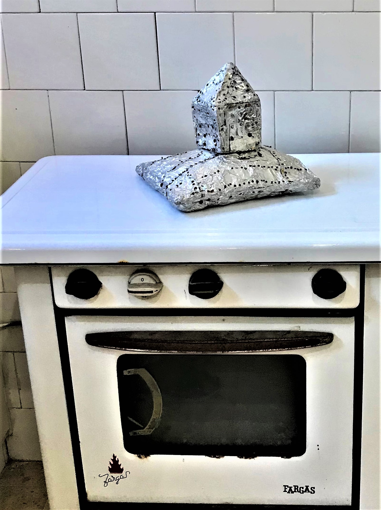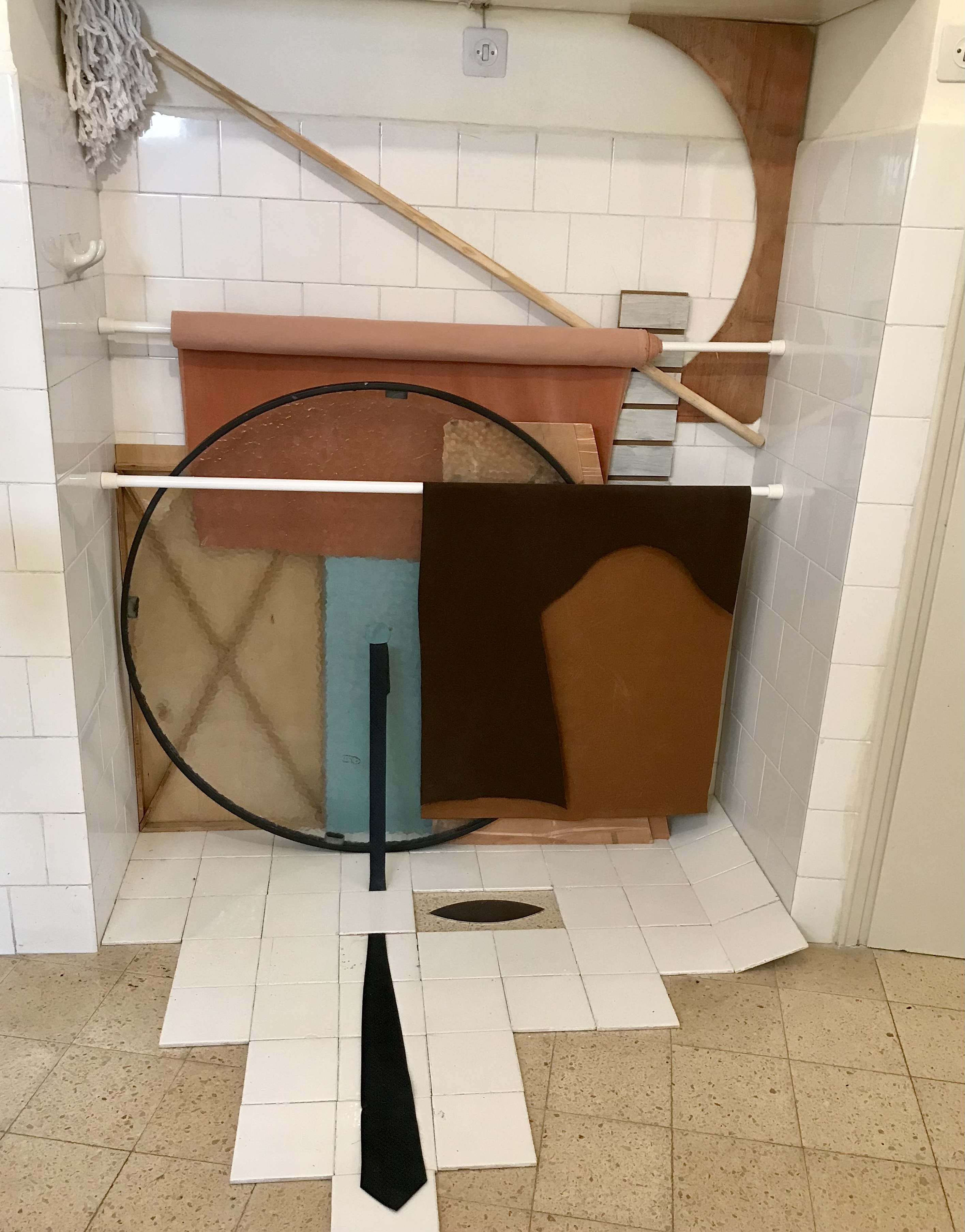 The only work by Ryback in this section is from the series “Shtetl, My Destroyed Home, A Recollection (Synagogue),” with its association to Etti Abergel’s House on a Pillow (1996), placed on the kitchen stove. The generic house on the pillow, like a precious gift of memory, when placed on a stove, creates a context of danger, fire, and longing (also bearing an outstanding similarity to works by Belu-Simon Fainaru. The kitchen is also the site of an excellent piece by Eden Bannet, a cross between markers of a male figure with a tie in the domestic sphere and a parody of it like the floor squeegie standing like an