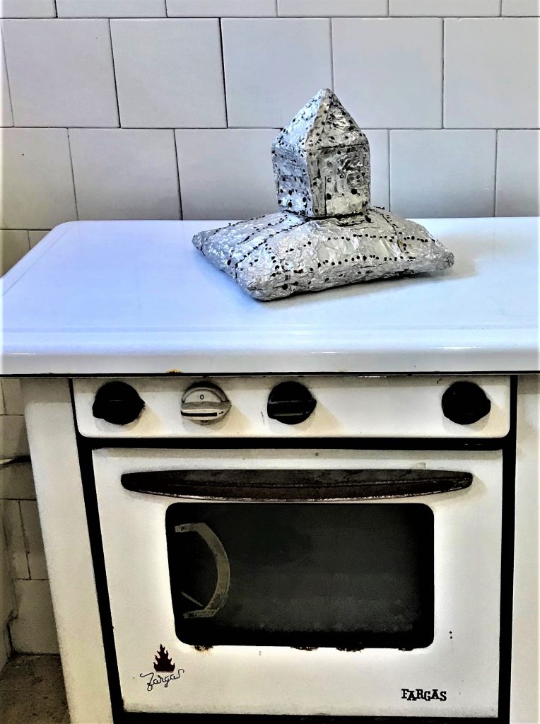 העבודה היחידה של ריבק בחלק זה היא מהסדרה “שטאטל ביתי החרב הוא זיכרון(בית כנסת) ” מתקשרת ל “הבית על הכרית” של אתי אברג’יל מ 1996 המונח על תנור במטבח. בית גנרי על כרית, כמו מתנה יקרה של זיכרון כשההצבה על התנור יוצרת הקשר של סכנה, אש וגעגוע. (הדמיון בין עבודה זו לעבודות של בלו סימון פיינרו בולט ביותר). במטבח מוצבת גם עבודה מצוינת של עדן בנט, מיצב שיוצר הכלאה של סימוני דמות גברית, עניבה, בתוך הספרה הביתית ופארודיה עליה כמו המגב שמונח כסוס דימיוני של ילדים. בנט משתמש בחומר שנראה שיוכל להתקפל ולהעלם כמו קסם, כמו הבזק של עבר בתוך הווה. פסלים של שני פרי-נס, ספר ופיסול קטן של מיכל הלפמן, כמה אובייקטים פיסולים סיכות או תכשיטים של נעמה ערד, המוצבים על שידות וספריות נוגעים בעצבים החשופים של בעבוע זיכרון ועלבון השכחה שמפעמים בסיפור התרבותי שהבית מגלם. בכניסה וביציאה, שני פסלים של נועה שוורץ, הכלאה בין אבני מצבה לפיסול מינימליסטי וסימונים שאמניסטים מביטים בצופים, תמרור לדרכים שנזנחו.