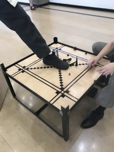 The performers go through a series of actions comprising acting, moments of private introspection, and encounters that have an erotic, mystical, or religious aspect. At the center of the actions is the game table, which is dismantled and changed. Cylinders, similar to those used in jewelry displays, are installed on the table, reminiscent of palace towers or graves (Yad Avshalom). Their arena is defined as a space on the floor measuring 8.40m X 8.40m, as set by Curator Ruti Direktor in the series of special events, The Live Square. It functions as a diffuse space: viewers who want to enter the arena and stand or sit facing the performers, which makes them into participants. During the hours I watched the work, some people who sat near the game board looked at the performer who moved the pieces as if they were playing chess with him.