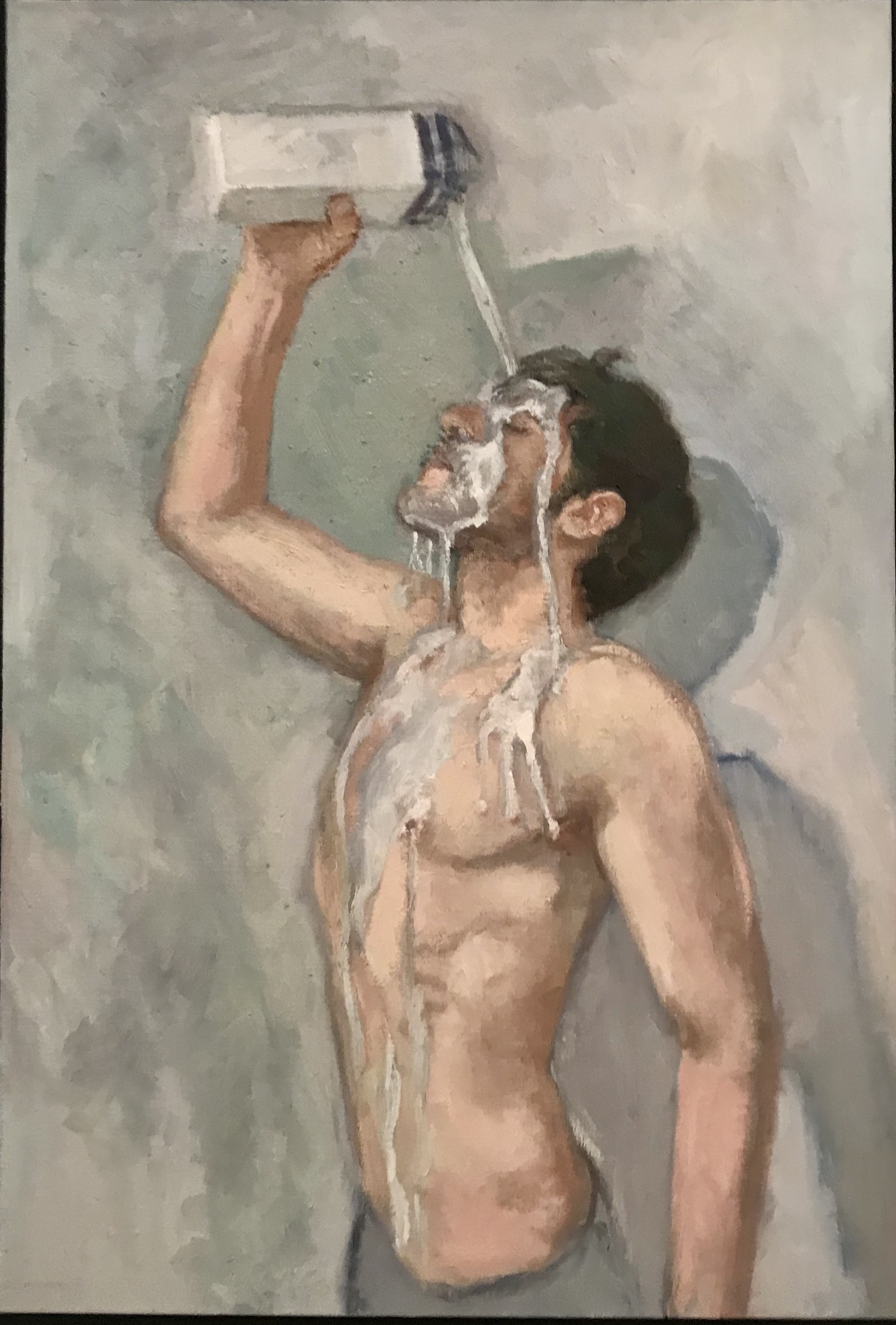 Hemed’s painting of a man in the pose of a classical statue (Spinario, man extracting a thorn), is also a lame visual joke on the same level. These and other paintings lack good “painterliness” – a quality whose definition is much more elusive than contemporaneity or the long list of artists mentioned in the wall text, from Caravaggio and Cezanne through Manet and Hockney. The paintings on exhibit are flat and empty, like a stage set simulating an exhibition.