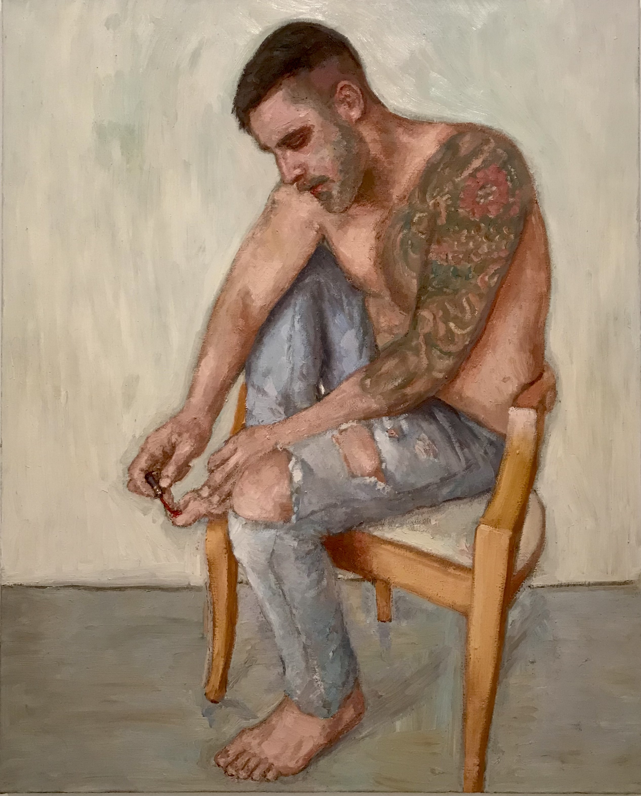 ציור של גבר בתנוחה של פסל קלאסי (מוציא הקוץ Spinario) גם הוא בדיחה חזותית עילגת באותה רמה. בעבודות אלו ובשאר העבודות בתערוכה חסרה ציוריות טובה – האיכות הזו שהגדרתה חמקמקה בהרבה מדיבור על עכשוויות או מהרשימה הארוכה של אמנים שמוזכרים בטקסט הקיר בתערוכה, מקרוואג’ו וסזאן עד מאנה והוקני. הציורים בתערוכה שטוחים וריקים – סט תפאורה שמדמה ציורים.