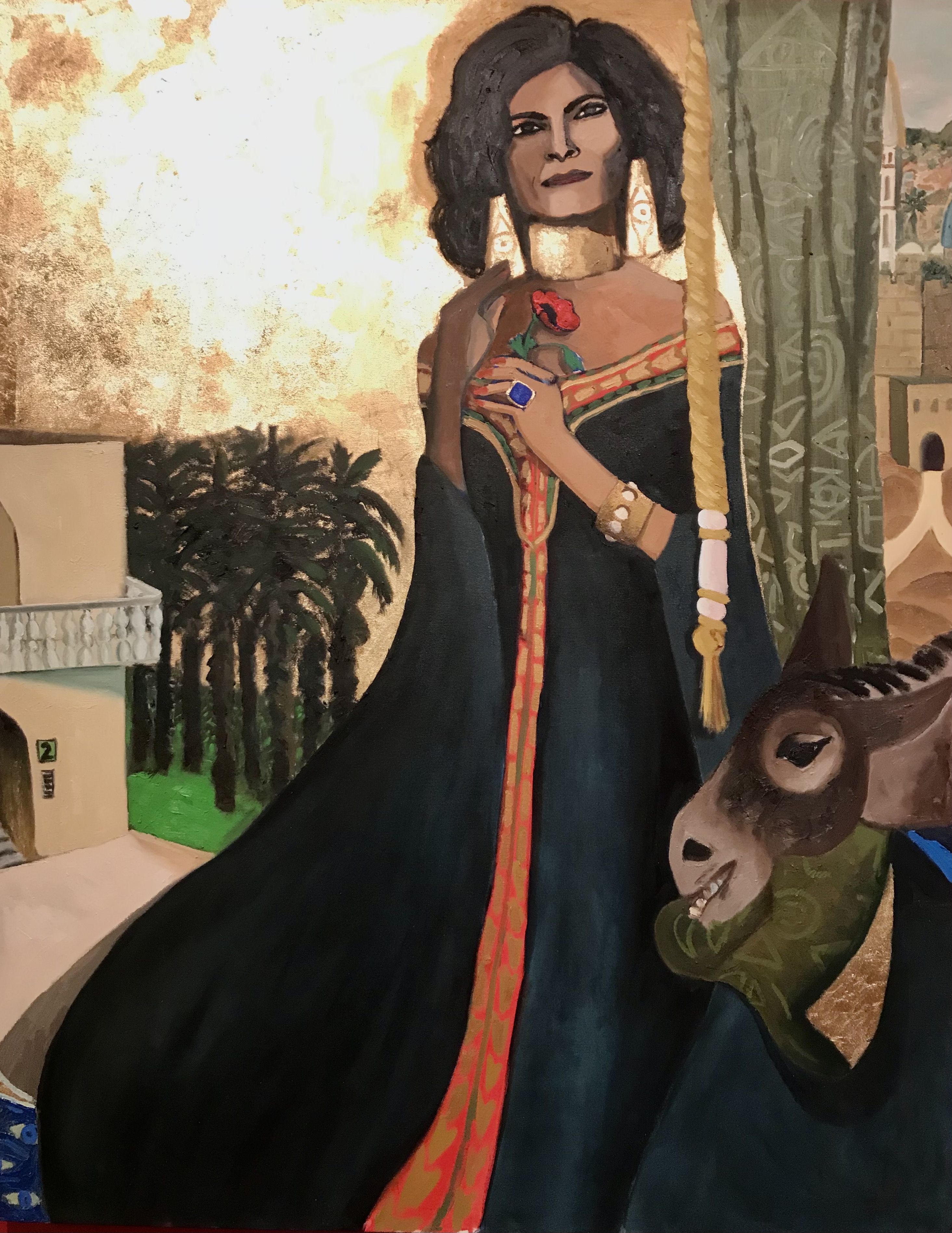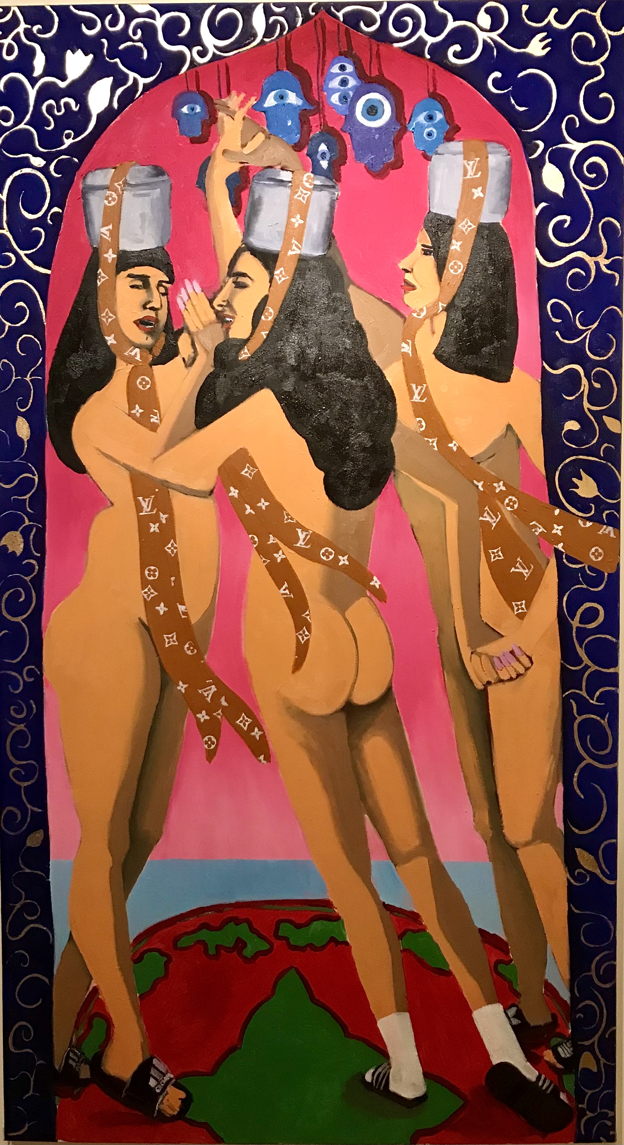 Similar to Hemed, Guy Levy’s Wild Flower is a reminder of lesser aspects of postmodernism. His quotation of Klimt’s Portrait of Adele Bloch-Bauer (1907) including the famous jewelled collar, in the painting Wild Flower of a woman against the backdrop of Old Jaffa with a Reuven Rubinesque donkey at her side, or the use of Louis Vuitton logo on the ribbon decorating three Graces alongside paintings of Hamsa good luck symbols, are superficial, stereotypical statements about East and West. Good painting, painting whose essence does not lie in the degree of precision with which the painter chooses to “copy” the world but the way in which the painter creates a world, often redeems banal thoughts and ideas. It only takes a thought about the differences between innumerable paintings of the Last Supper and the memorable, exciting ones. These exhibitions lack such “redemption,” leaving canvas and paint to remain as hangers for ideas that are no more than the new conformism.