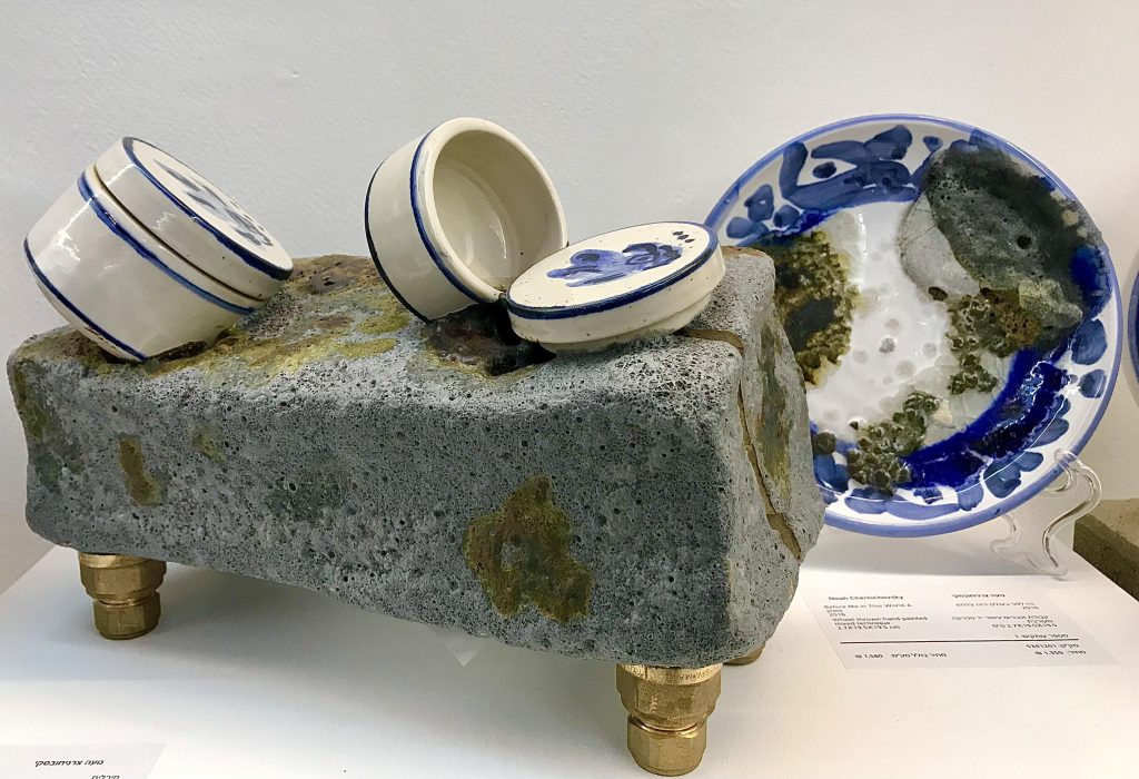 Dana Cohen’s works from shredded textile waste are lovely, and Itay Matan’s painting is impressive. I am curious to see how they develop in the future. Ori Zamir’s sculptures are beautiful but whoever remembers the charming installation of those same works in the tiny space of the Ofnobank Gallery (closed) can only regret the current display. Noa Chernichovsky’s concrete-coated ceramic Outstanding are Noa chceramic concrete-coated works by Noa Chernichovsky, a congealed drama of breaking the vessels and the materials from which the cityscape is constructed bursting out of them.