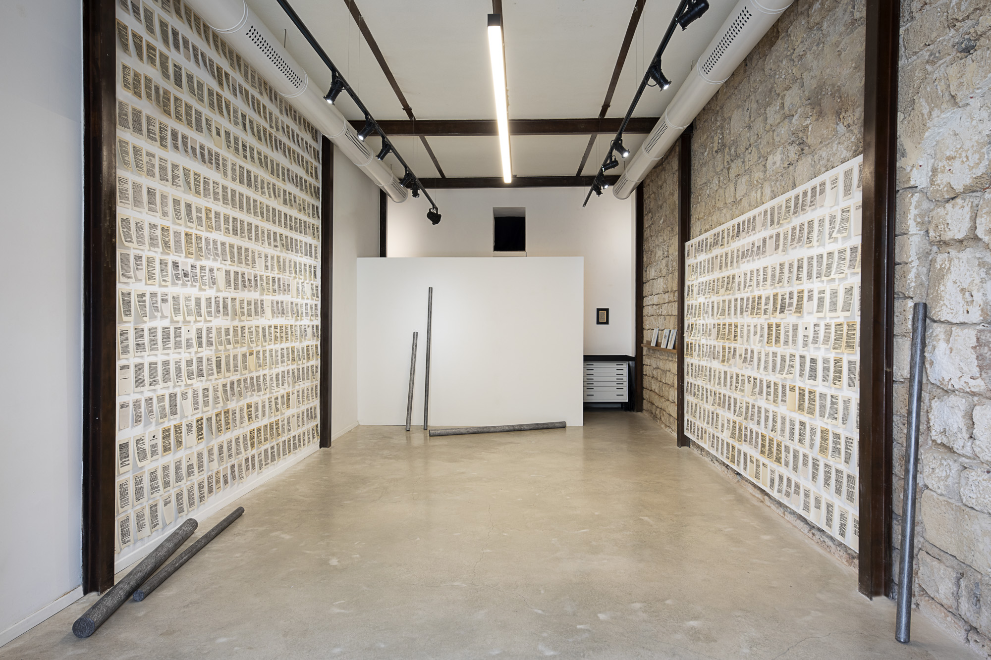 Row upon row of pages surround viewers; cylinders lean on the walls like poles from an unknown game, or closed scrolls. The cylinders are covered with monochromatic graphite, while a close examination shows that they resemble the texture of skin. The “pillars” are undecipherable, as if they emerged from a Romantic painting of ancient ruins destroyed in violent events, in a dialogue with the torn-out pages. They evoke the cyclic nature of time and the stratification of knowledge, the way in which images change yet stay engraved in cultural memory.