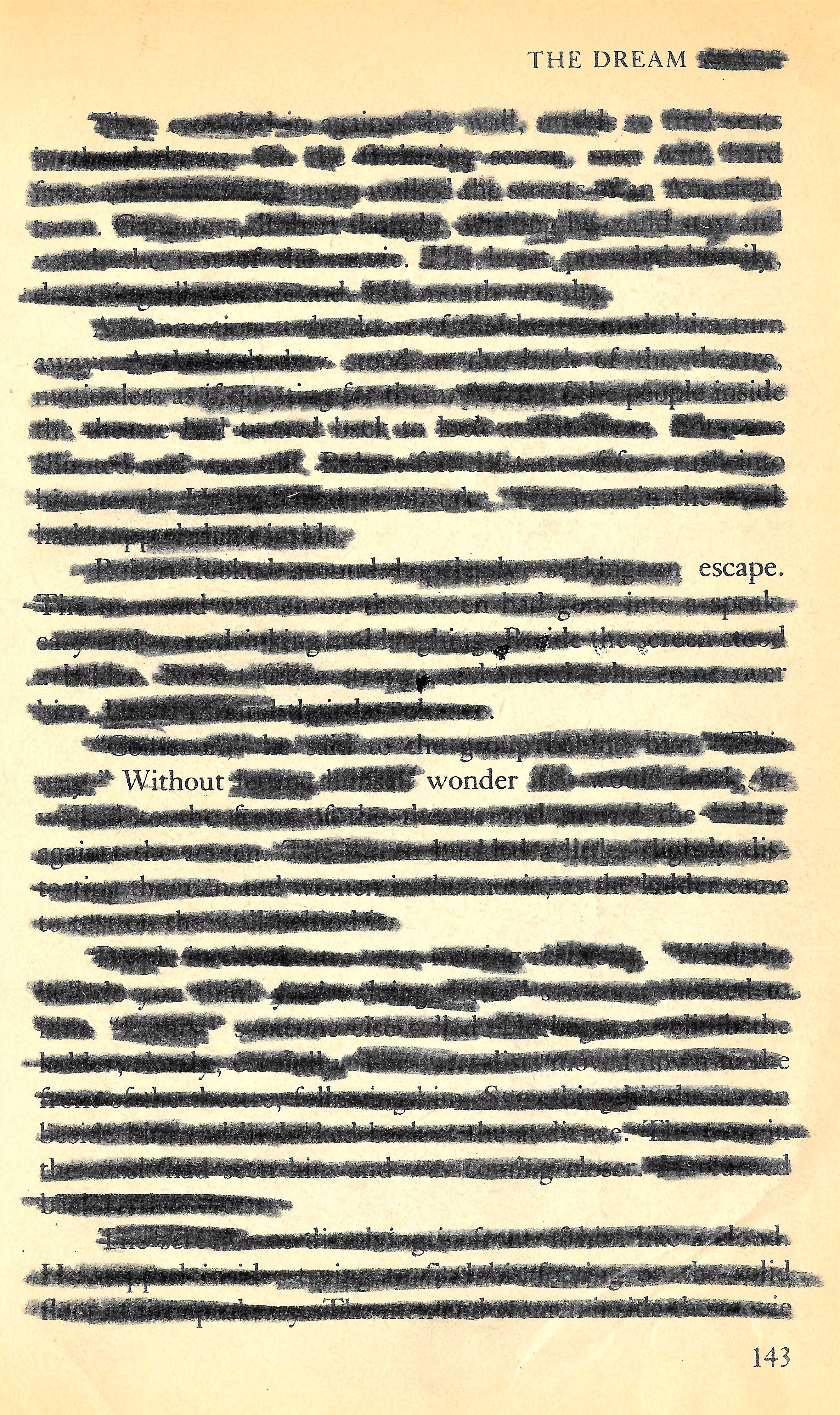במשיכות בעיפרון רך, היא מכסה על השורות המודפסות, תוך הקפדה לשמור על פסקאות ורווחים; מלים יחידות, שורות אחדות, שהיא מותירה גלויות, מתלכדות לכדי משפטים קצרים ופואטיים.