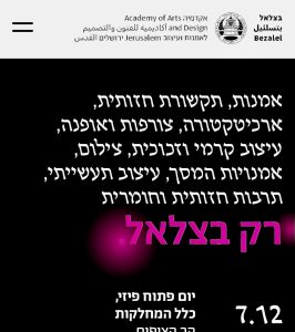 Screaming out “Only Bezalel,” the new poster announcing registration for the Bezalel Academy of Art and Design appears adjacent to the headline wishing for force. The aggressive power that strikes acquired in the political discourse (that we hope has become a thing of the past) is supposed to be useful in recruiting students, similar to the slogans “Only Bibi,” or “Only the Likud can.” It is not calling students to register because this is an excellent academy offering something different from other schools, but is nullifying all that is not “Bezalel,” implying that there is only one academy and nothing else exists.