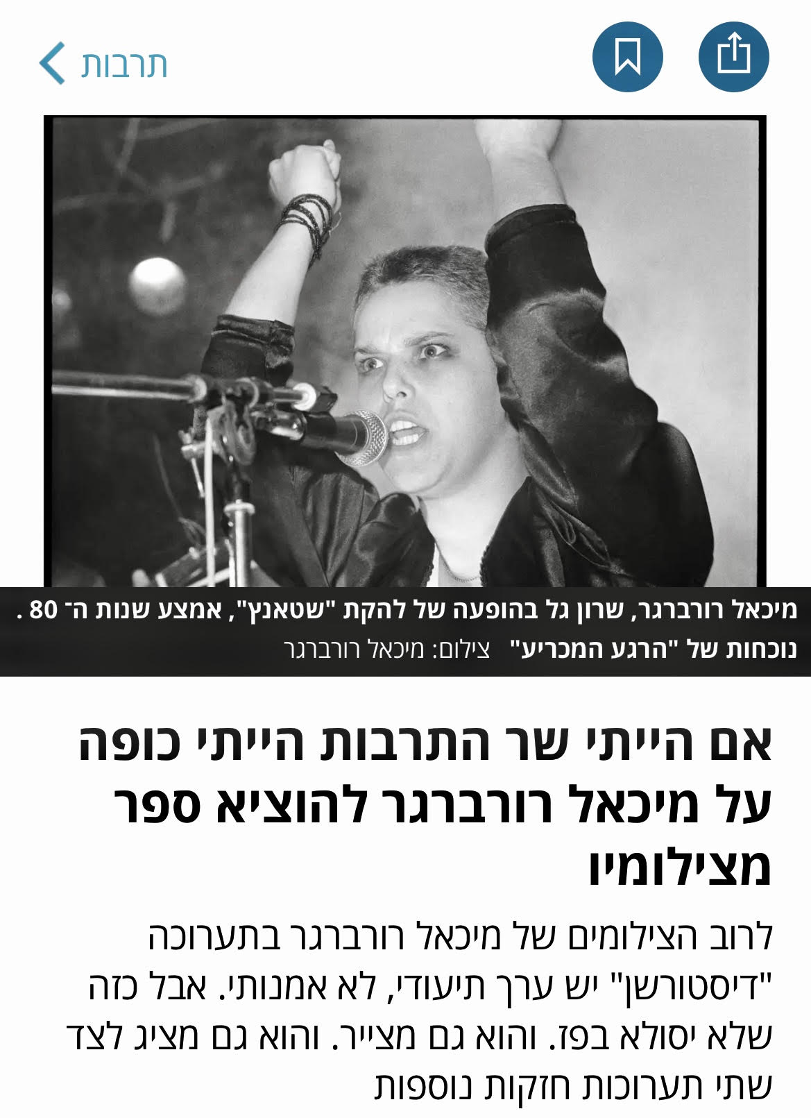 “If I were Minister of Culture, I would force Michael Rorberger to publish a book of his photographs”: this header of Avi Pitchon’s art criticism published last Friday is disturbing. Perhaps it’s only that the humor doesn’t work, but the word “force” in a cultural context is problematic. When this is offered in a headline in Haaretz as an ideal action, my sense of humor disappears. Maybe “suggest” or “beg” or if this were an operational desire it could be “finance,” but to use the word “force” for a Minister of Culture? As I see it, these words should not exist in the same sentence. Force in general is not something that I feel we should strive for.