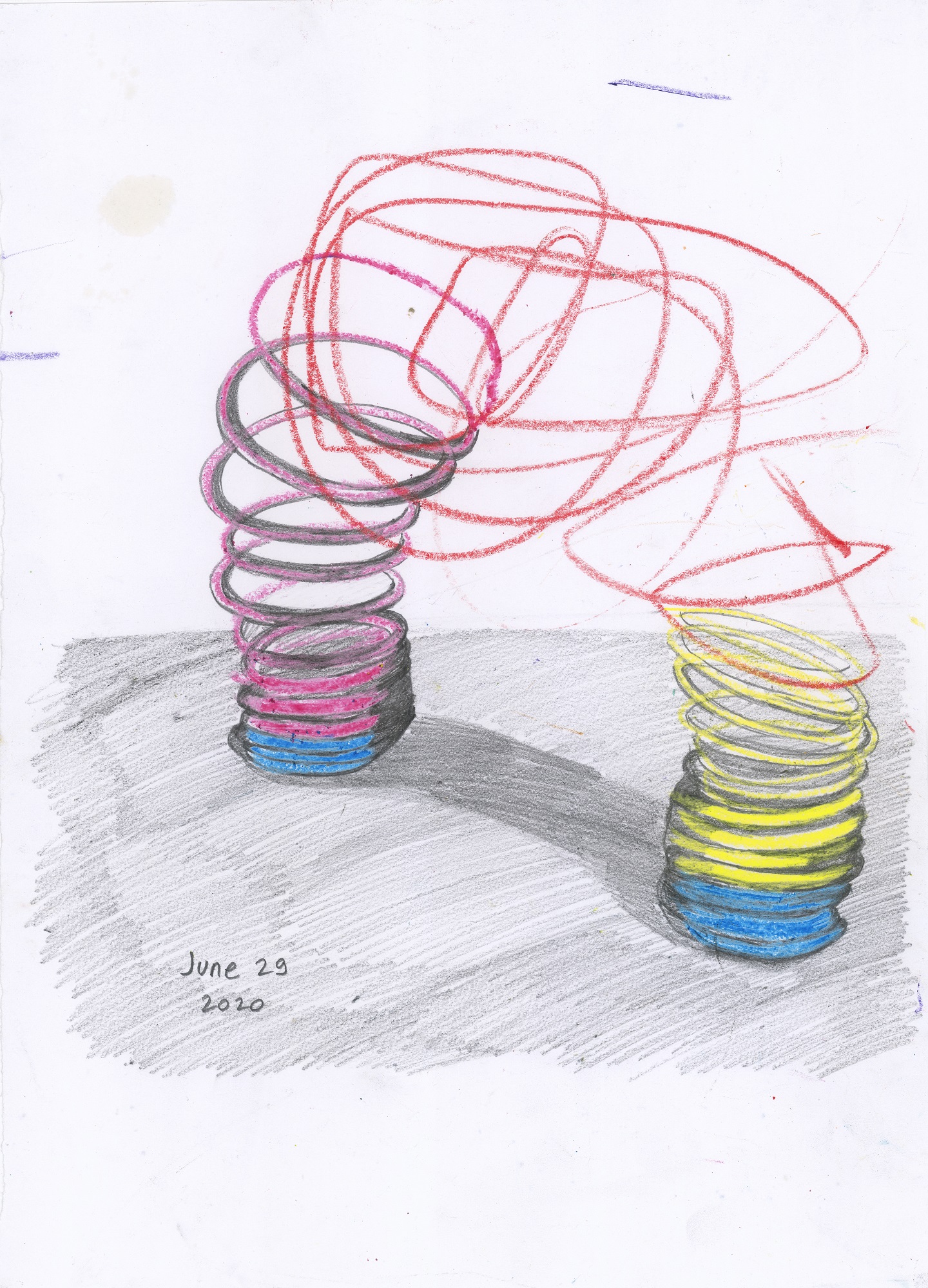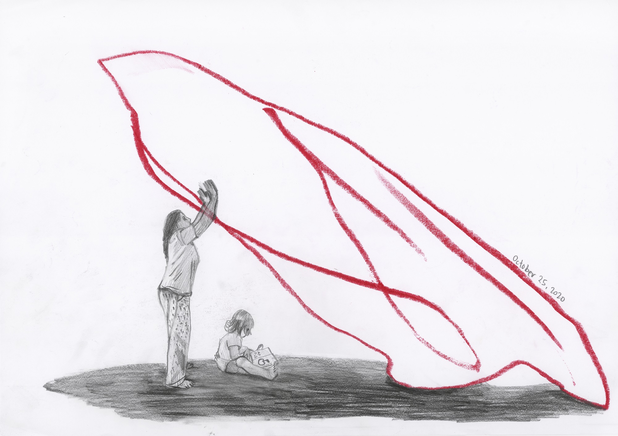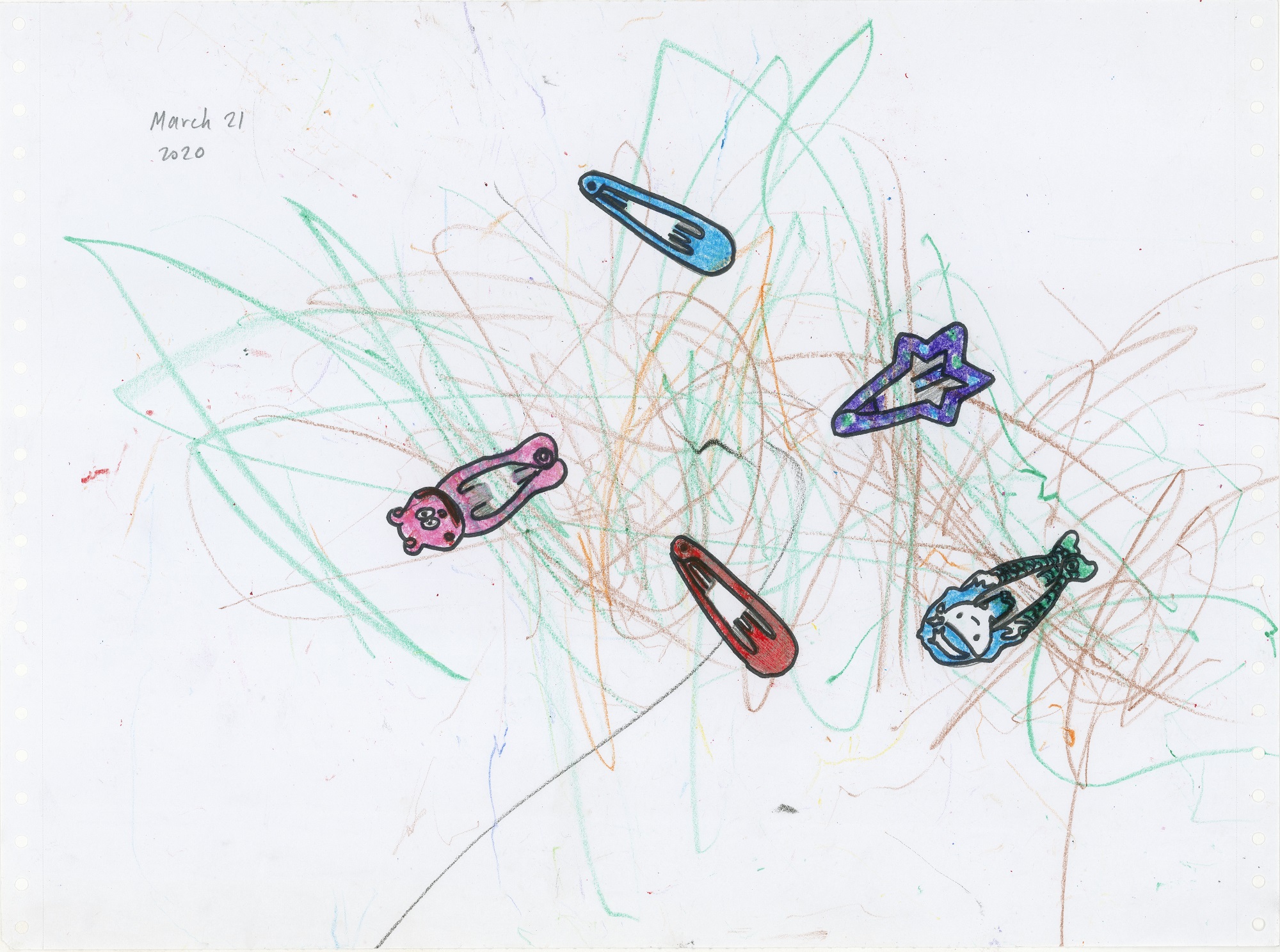 המפגש עם העבודות של אסמיני בתערוכה יוצר הזדמנות להתבונן בהן באופן שונה. בתערוכה הן מקבלות חריפות, שההתבוננות בהם כנרטיב מתמשך, בדפדוף מרכך. אסמיני ציירה את העבודות החל מפרוץ הקורונה באביב 2020. אלו הם בעיקר רישומים בעיפרון, חלקם לצד שרבוטים של בתה. המפגש של הרישום והשרבוט יוצר רגעים יפים תרגום לקו של הגדילה המשותפת , התהליך של אם ובת בתנאים הבלתי רגילים, האינטנסיביים במיוחד, שנוצרו בתקופה זו. השילוב עם הטקסטים לא תמיד הכרחי, לפעמים פרשני מידי.