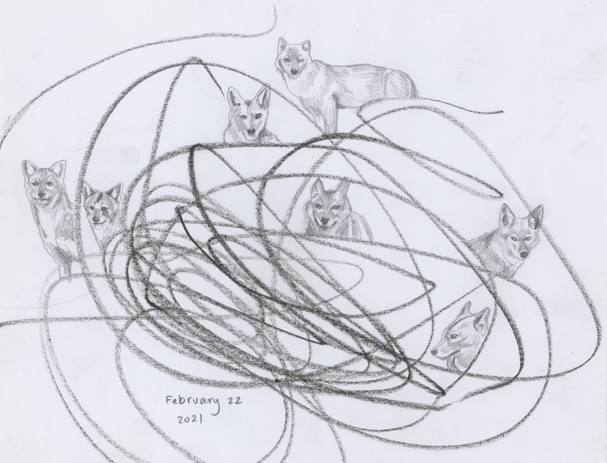 The exhibition offers an opportunity to encounter Asimini’s works differently from in the book. Observation of the hanging pictures has them take on the sharper aspect of a continuous narrative which is less edgy in the book. Asimini made these works from the beginning of the pandemic in Spring of 2020, mainly pencil on paper, some alongside scribbles by her daughter. The encounter between drawing and scribble creates some beautiful moments, a translation of the shared growth into line, the process of a mother and daughter experiencing unusual circumstances under especially intensive conditions created during Covid. The combination of text is not always necessary and sometimes too interpretive.