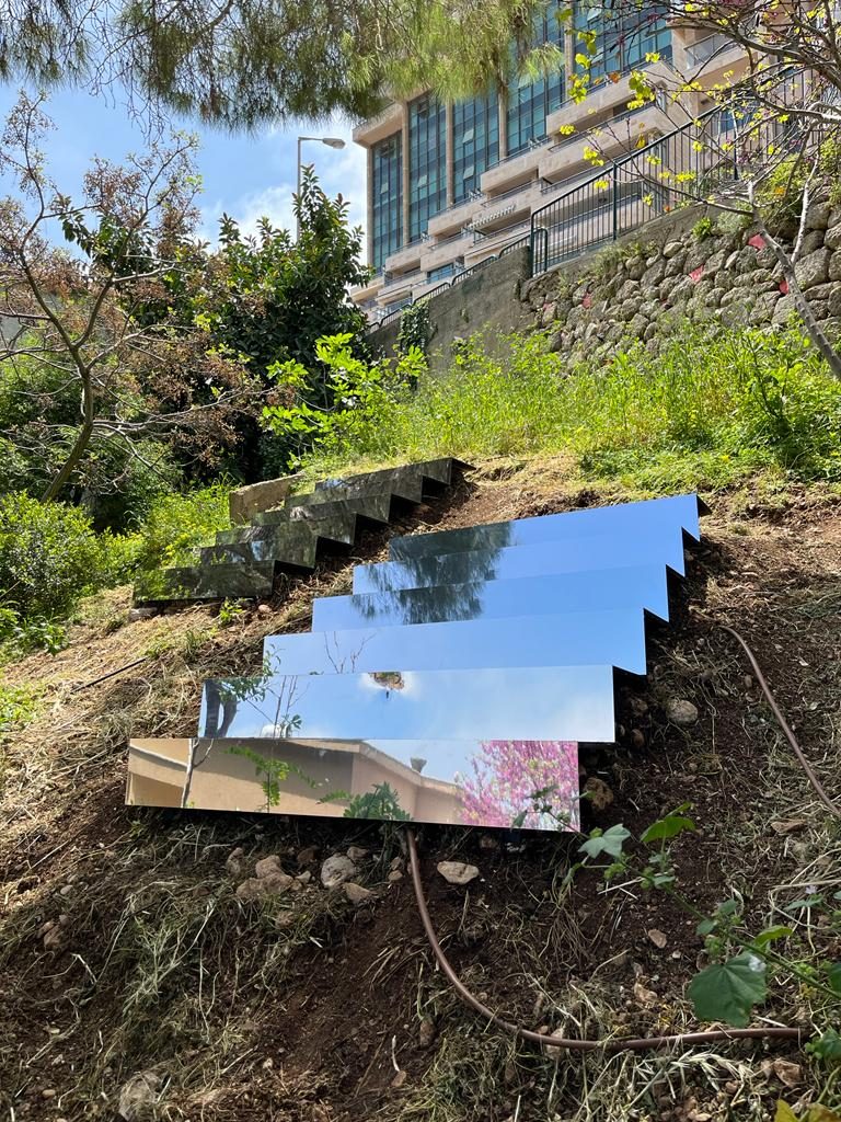 “Two Imaginary Points, and the Landscape” (curated by Zeela Kotler Hadari) is an installation of artworks in the Stairways area of Haifa connecting the Downtown with Hadar Hacarmel and the Carmel Merkazi neighborhoods. Wandering through the stairways is a pleasant walk through a lovely landscape while the art is well-mounted with clear signage. However, for the most part – at least in the route from Yefe Nof to Golomb, it is mediocre. Standing out are works by Belu Simon Fainaru, Orit Siman-Tov, Iddo Markus, Iris Cintra, and the collaborative work by Alon Eckhaus, Yegor Adamovich, and Lotem Hamama.