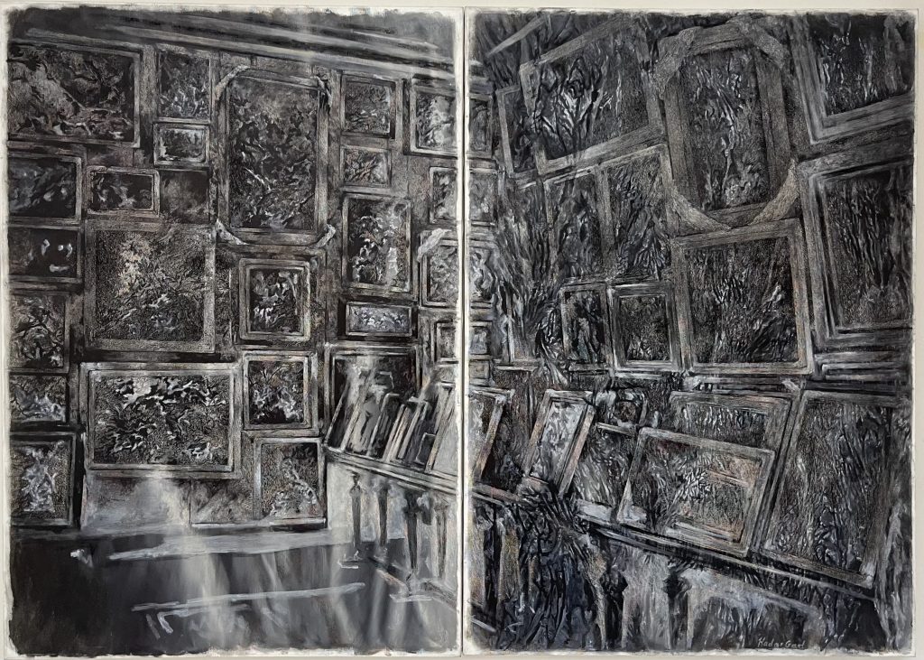 Hadar Gad’s extended observation of the desecrated cultural treasures gave rise to their power and voice as well as thoughts on the very being of art. Gad painted mountains of books and paintings with no human figures, creating a dialogue between objects and memories, entities of thought, imagination, and stories. The void at the heart of Jewish and universal culture is commemorated precisely in the excess of everything and nothing.