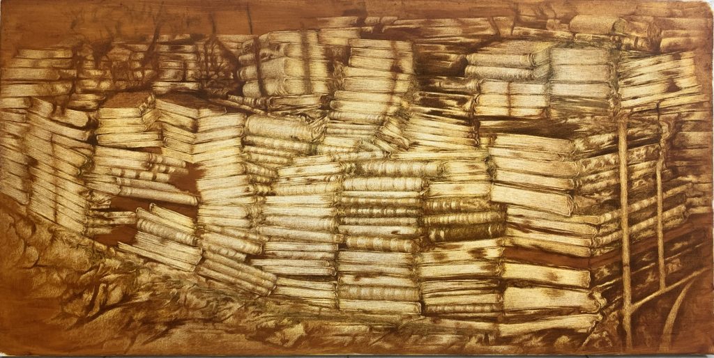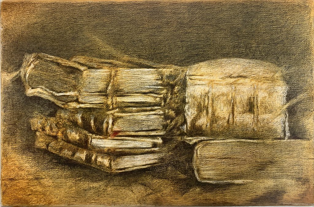 It is interesting to think about Gad’s painted stacks of books in relation to Monet’s Haystacks at Giverny (1890-1891), a series of 25 paintings of haystacks depicted at varied times of the day under differing light conditions. Its subject is essentially the passage of time. In Gad’s paintings, the various stacks differing in shape and size preserve layers of consciousness and time, knowledge and insights which form the infrastructure of spiritual existence.