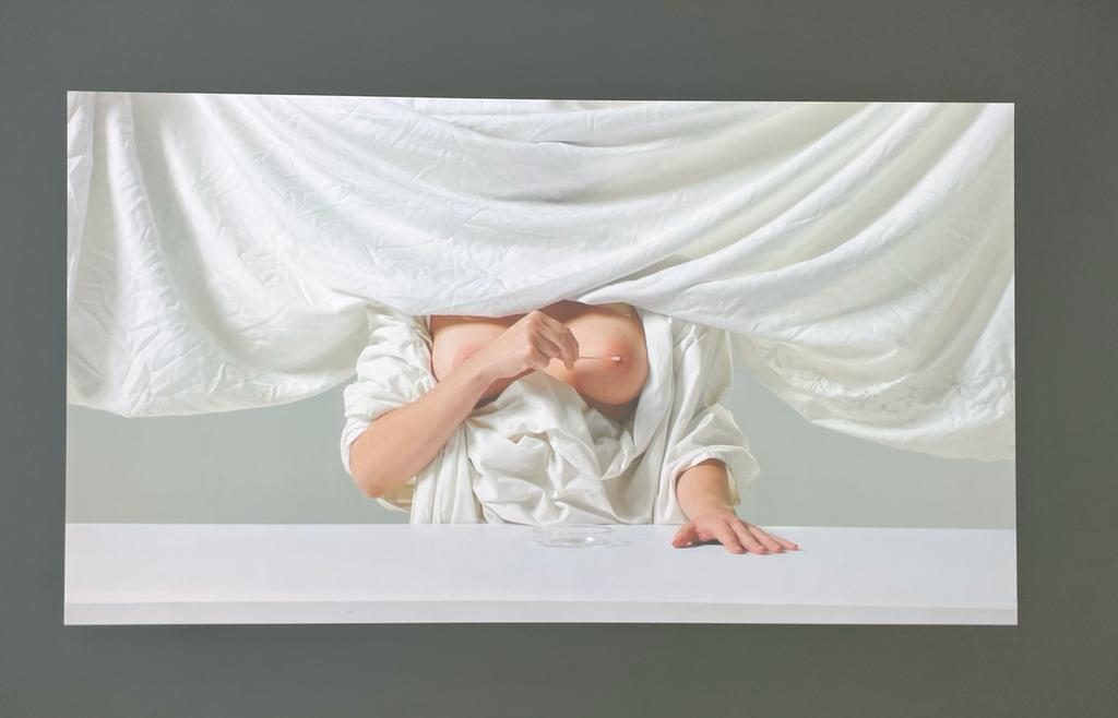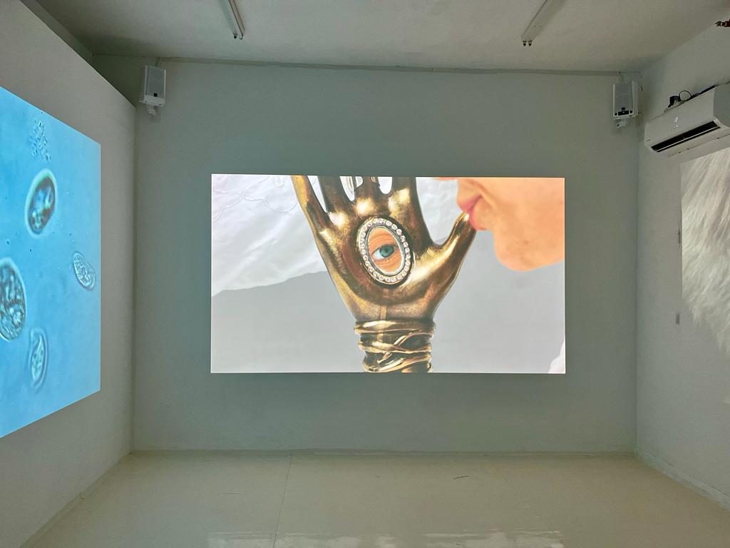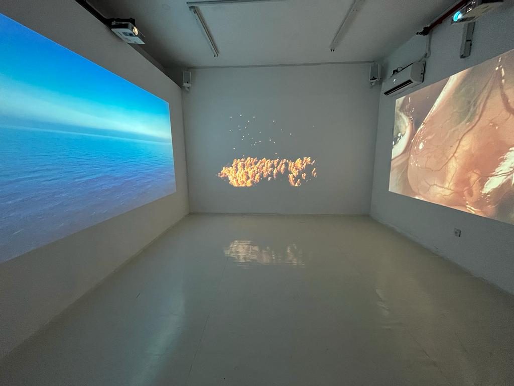 Standing out is Elena Ceretti Stein’s three-channel video work Nexus, 2022, looping a continuous stream of images creating narratives of an internal journey into the body, a journey through art history to images some of which are iconic, such as Dorothea Tanning’s 1942 painting Voltage. The work is dedicated to the artist’s mother who passed away only a few months before the exhibition, who was engaged in research on microbes, bacteria, fungus, and viruses existing naturally in the body of organisms. The subject is life itself as a system that remains captivating and often confusing even if never fully understood. The highly finished images, and the flood of data transmitted by the artist’s voice with music by Yehezkel Raz in the background, evokes a feeling of a quest , a search. It is reminiscent of the wonderful Grosse Fatigue (2013) by French artist Camille Henrot that engaged in an encyclopedic panorama of life and history. Ceretti Stern is an artist with an unusually broad approach to art-making whose work I have been following for several years. It is sufficient to see just how different this work is from her excellent solo show “Habitus” in 2021 at the P8 Gallery (curated by Hadassa Cohen) reviewed on www.smadarsheffi.com/?p=14290